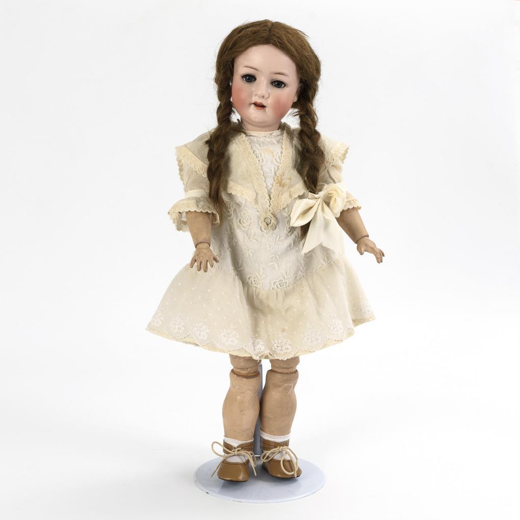 Kurbelkopf, blaue Schlafaugen, Wimpern, braune Echthaarperücke. 15-teiliger Gliederkörper. Weißes Kleid, jünger ergänzte braune Schuhe. Kopf durchleuchtet: ohne Defekte. Körper übermalt und berieben.