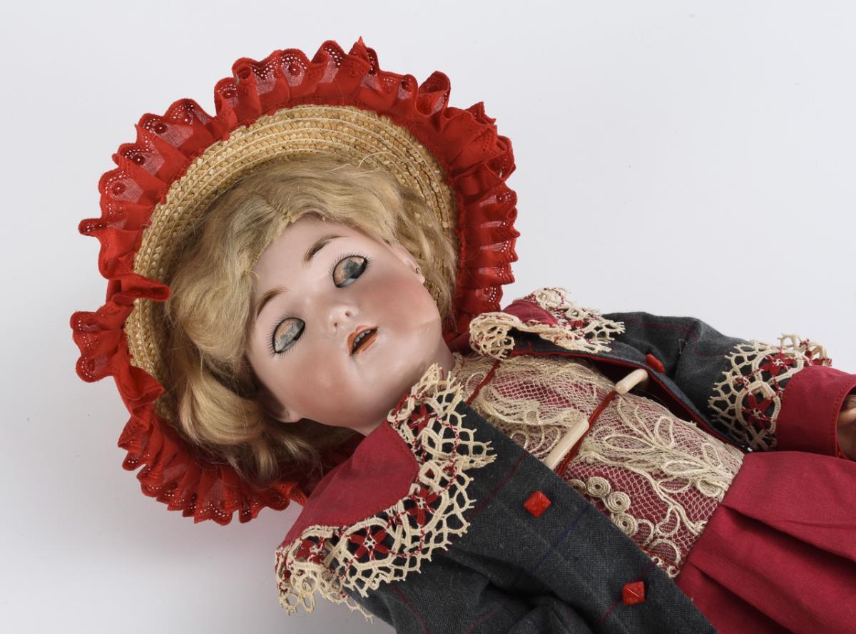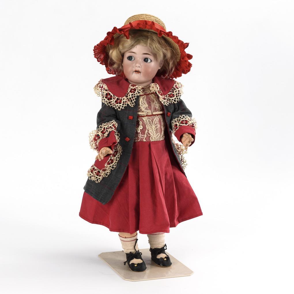 Kurbelkopf, blaue Schlaf-/Schelmenaugen, Ohrlöcher, blonde Mohairperücke. 15-teiliger Gliederkörper. Schöne rote Kleidung mit grauem Mantel und Hut mit roter Borte, aufwändig in alter Art nachgenäht. Kopf durchleuchtet: ohne Defekte, lediglich 1 winziger Chip am linken Ohrläppchen. Rechter Fuß defekt.