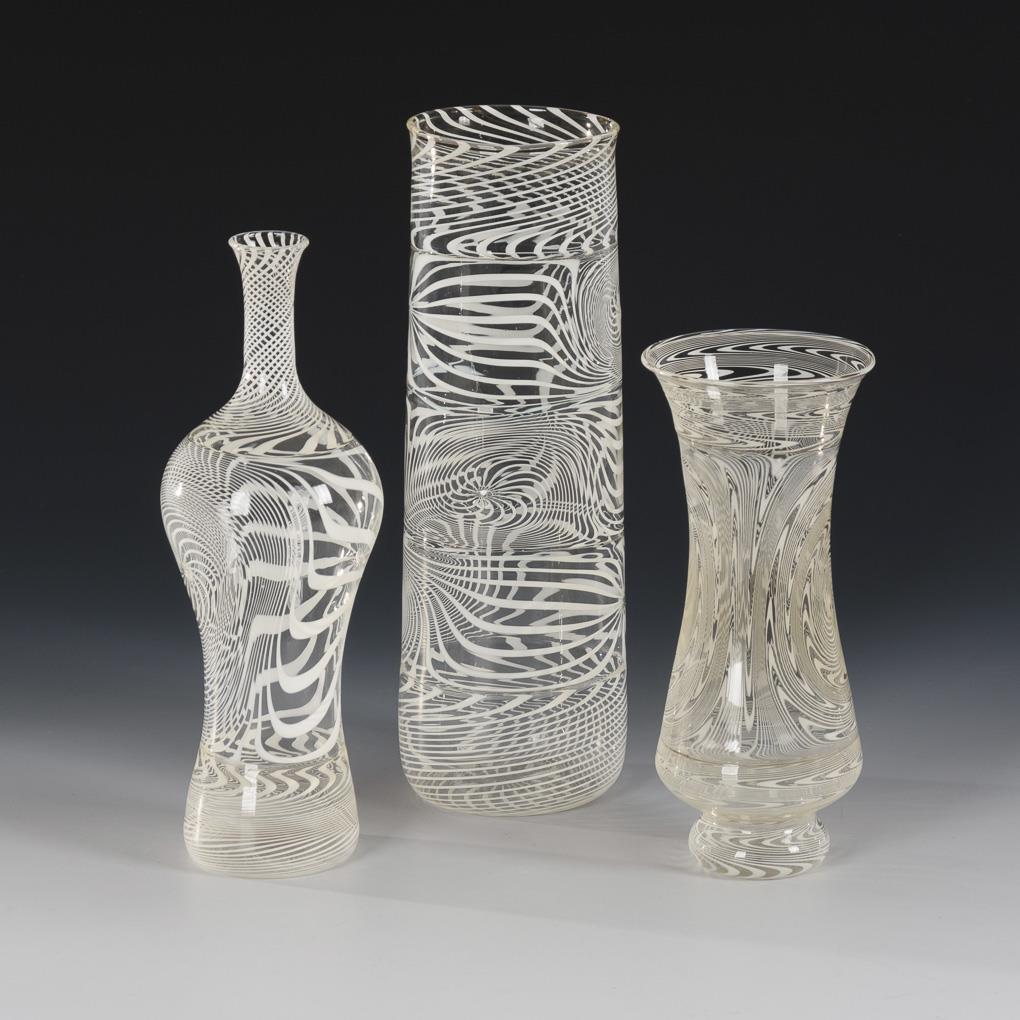 Montiertes und vor der Lampe geblasenes farbloses Glas mit opalweißen Fadeneinschmelzungen.