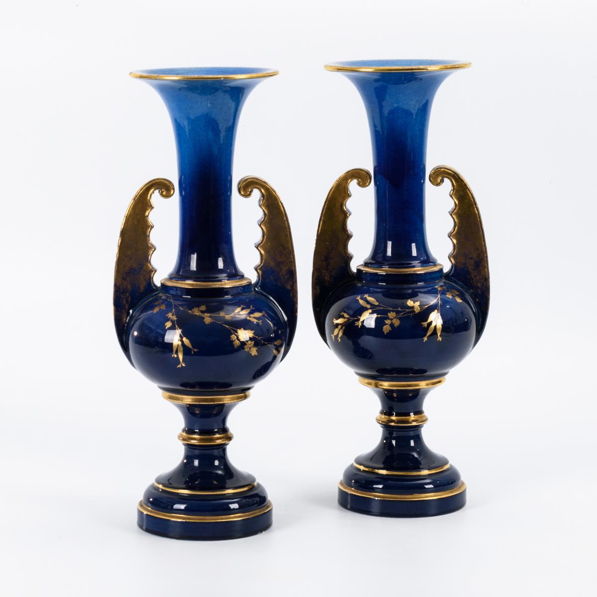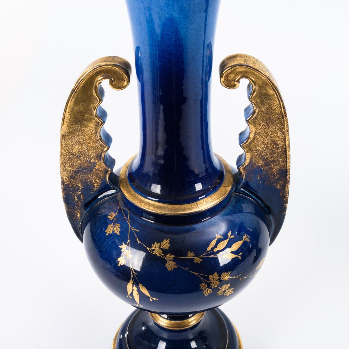 Steingut, kobaltblau glasiert und goldstaffiert. H 46 cm.