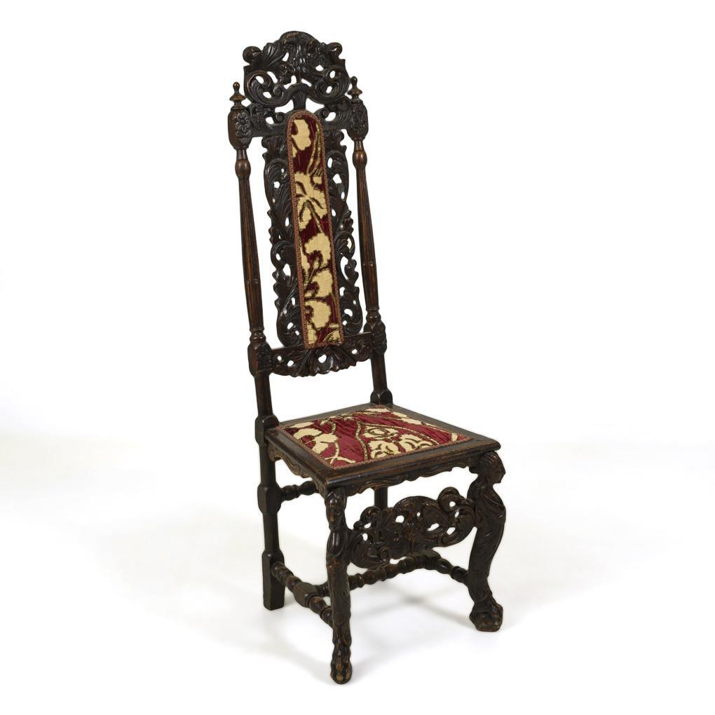 Gepolsterter Stuhl im Stil der Renaissance mit hoher Lehne und trapezförmiger Sitzfläche auf vorderen Karyatidenfüßen mit reich beschnitzter Mittelstrebe; teilgepolsterte, schnitzwerkverzierte Rückenlehne; Polster und Bezug aus weinrotem Stoff mit Floralzier. Alters-/Gebrauchsspuren, inaktiver Anobienbefall, restauriert mit Ergänzungen, Polster und Bezug ergänzt.