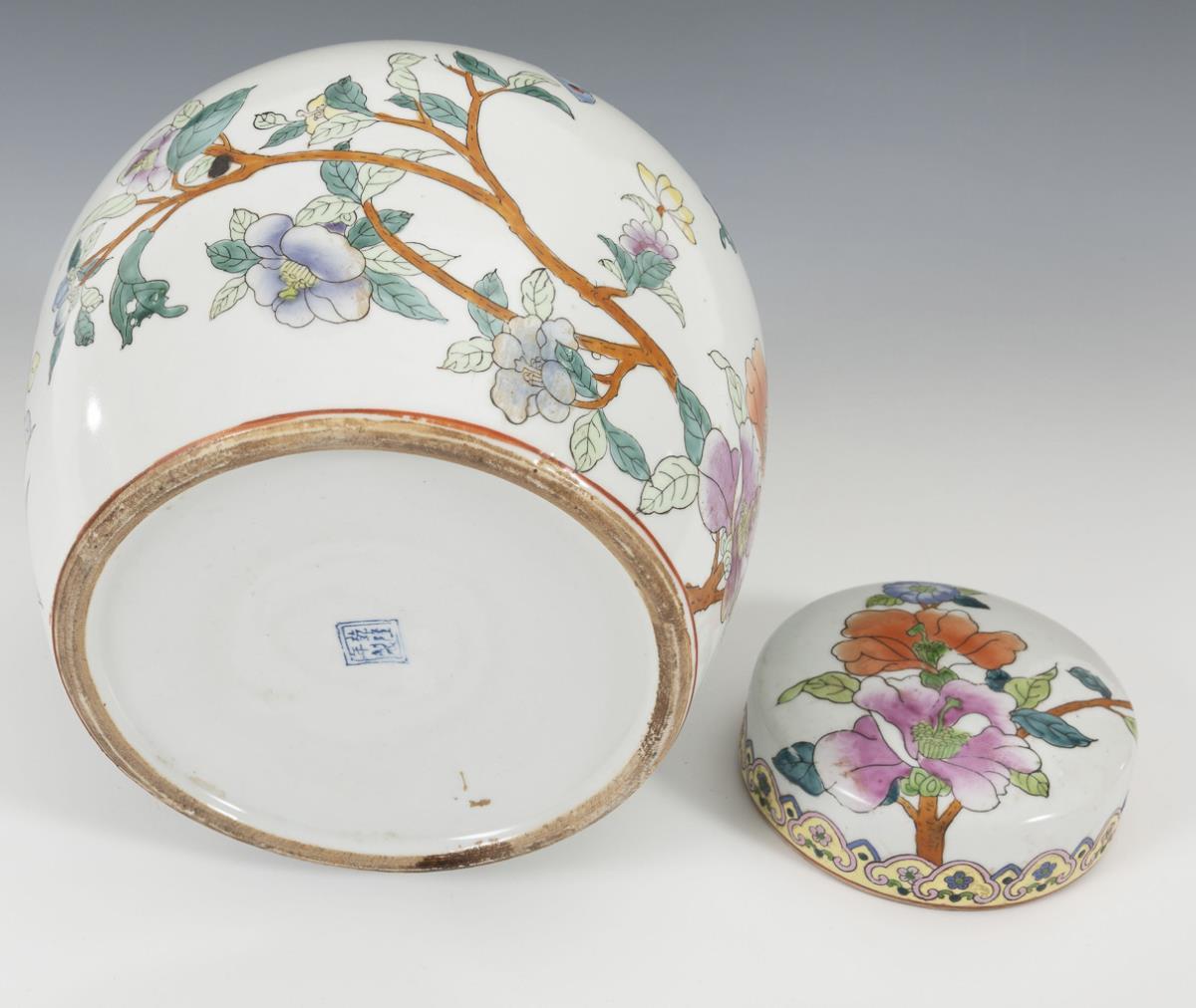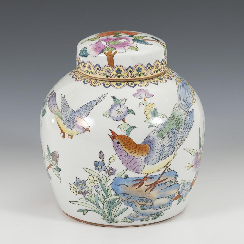 Polychrome Bemalung mit Vögeln zwischen blühenden Pflanzen.