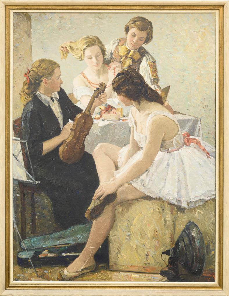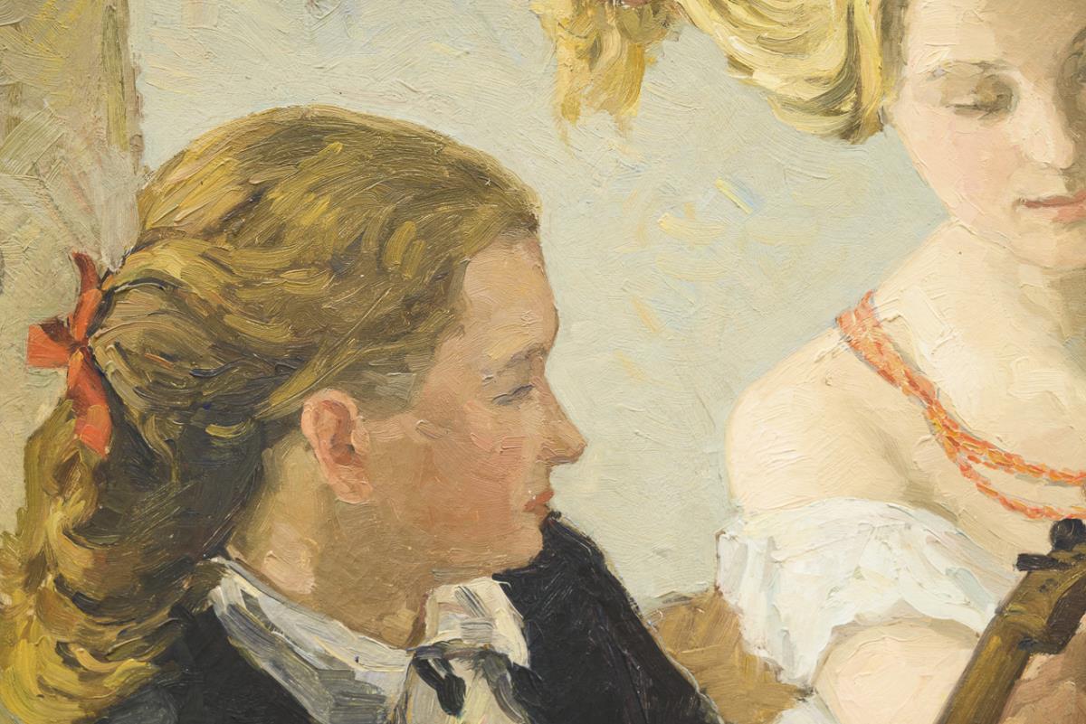 Die Mädchen beim Frisieren, teils Tänzerinnen, teils Violinistin in einem hellen Zimmer.