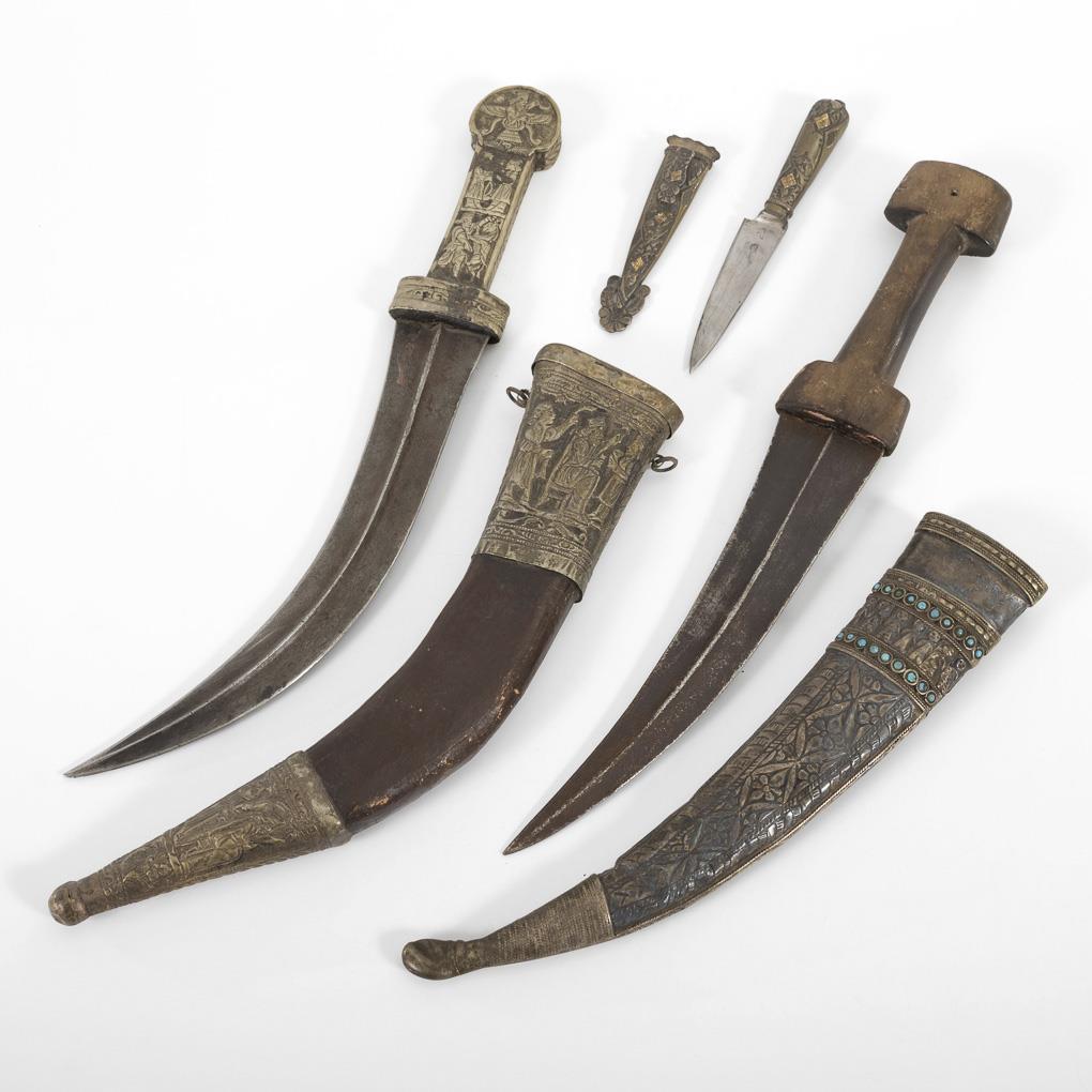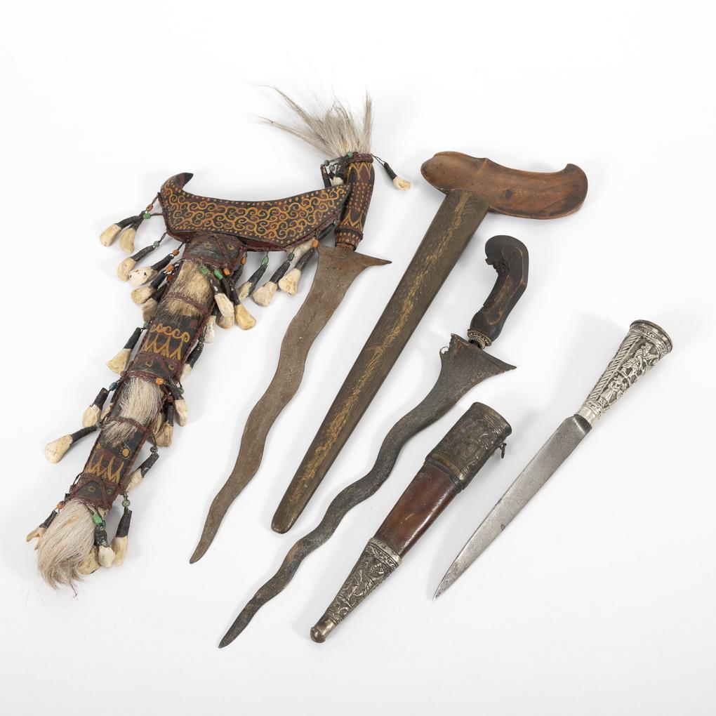 Keris luk 9, Surakarta, gewellte Klinge mit Altersspuren, beschnitzter Holzgriff. Holzscheide mit geschlossenem pendak aus Messsing. Schöne Waffe mit Altersspuren. L 50 cm. / Keris luk 7, mit Fell und abgehängten Zähnen. Surakarta. Gewellte Klinge stärker korrodiert, Griff und wrangka aus Holz und bemalt. L 51 cm. / Krummdolch mit zweischneidiger Klinge. Scheide und Klinge passen nicht ganz zusammen, jedoch beide mit reliefierten Beschlägen, auf denen figürliche Szenen der parsischen Kultur zu sehen sind, wie z.B. Faravahar. L 40 cm. / Messer mit einschneidiger, gerader Klinge. Metall mit schwachem Damaszenermuster. Konischer Griff, dieser und die Lederscheide ebenfalls mit figürliche Szenen der parsischen Kultur dekoriert. L 32 cm / Khanjar mit gekrümmter, zweischneidiger Klinge und einfachem Holzgriff, aber Holzscheide mit getriebener Silberummantelung, besetzt mit Türkisen. L 40 cm. / Kleines Beimesser. Gerade Klinge mit großer Inschrift "La Horedizo"(?), Griff und Scheide mit schönem Reliefmuster, L 17 cm.