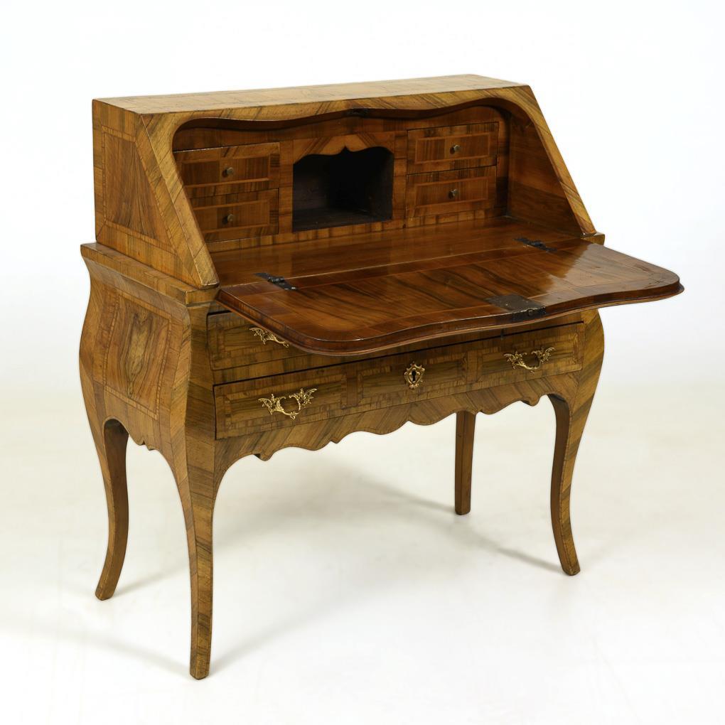 Zierlicher Aufsatzschreibtisch mit 2 Schüben und aufklappbarer Schreibplatte, auf 4 leicht ausgestellten Beinen, verziert mit Maser- und Spiegelfurnier, Bandintarsien und rautengefülltem Bandelwerk; innen 1 offenes Fach und 4 kleine Schübe.