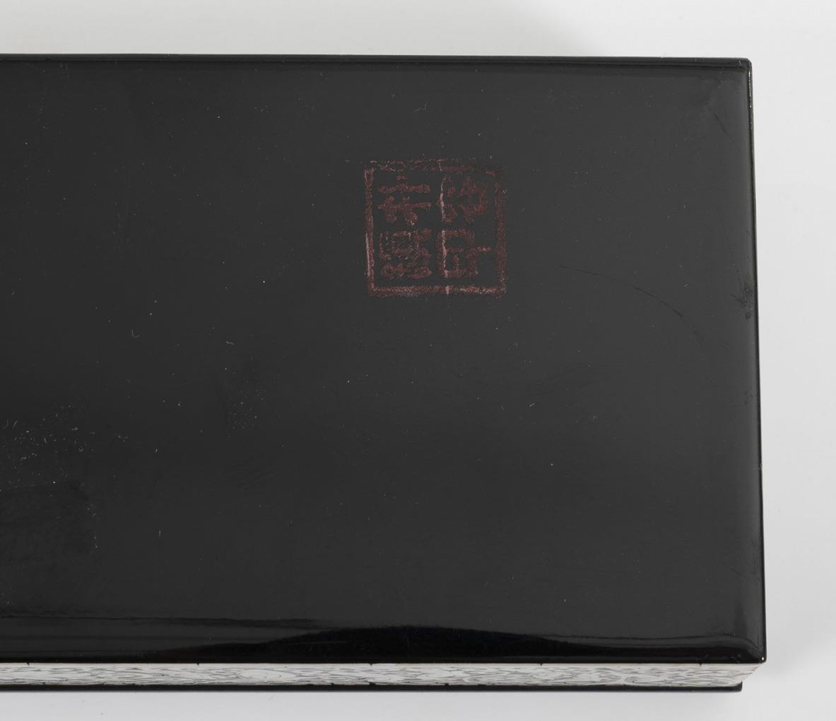 Rechteckiges Kästchen mit Rankenmuster und fliegenden Reihern als Perlmuttintarsien. Innen wurden die changierenden Teile der Pauamuschel verarbeitet. 23 x 8 x 4 cm. / Rechteckiges Lackkästchen mit Schmetterlingen und Blüten als Perlmuttintarsien, 5 x 20 x 10 cm. / Rechteckiges Holzkästchen mit Jadeeinlage und Fledermaus-Messingbeschlägen, 6 x 14,5 x 10 cm.
