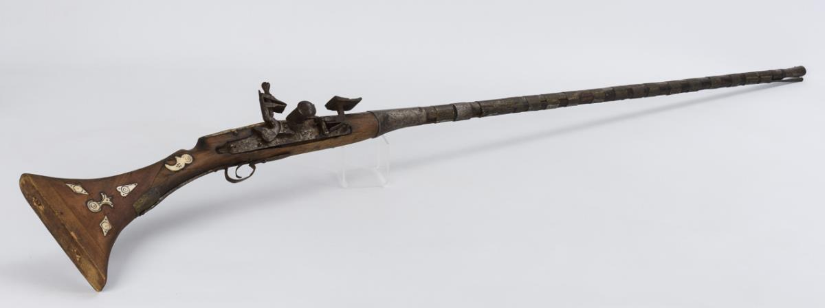 Sehr langer Lauf, dicht mit punzierten Messingbändern an den Schaft gebunden. Kolben mit ornamentalen Beineinlagen. Ladestock löst sich nicht. Alte Reparaturspuren. Alters- und Gebrauchsspuren, Metallteile mit Korrossionsspuren.