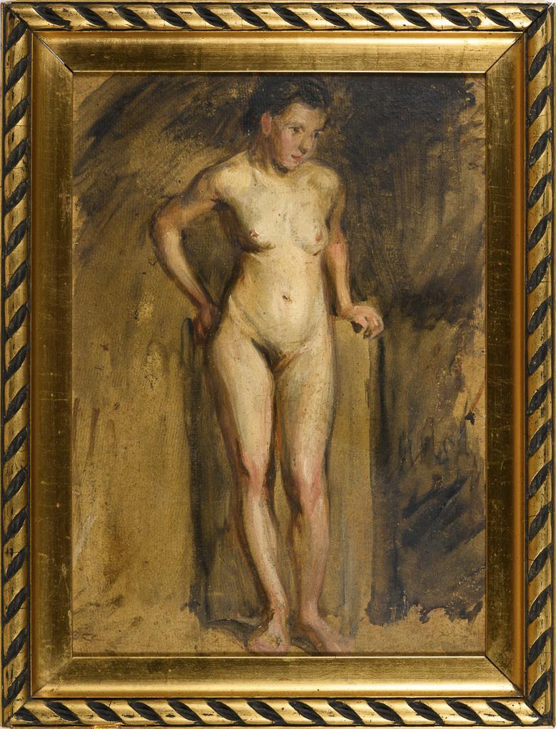Ölskizze einer jungen stehenden Frau im hellen Licht. Leichte Altersspuren.