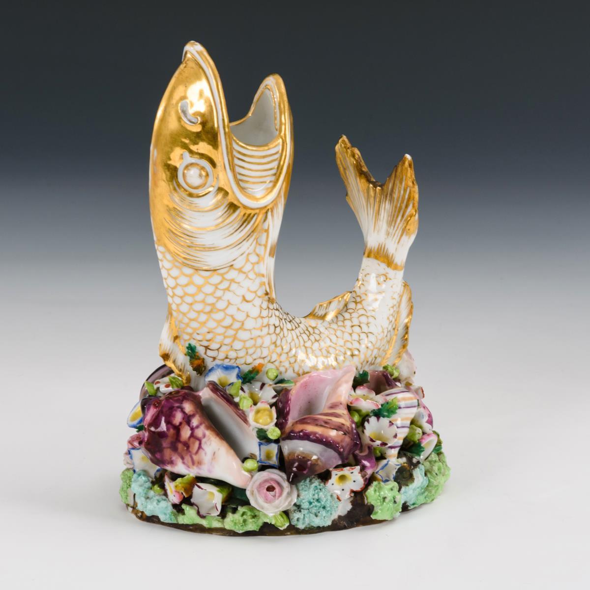 Gebogener Fisch auf einem mit Meeresschnecken und Blüten belegten Natursockel. Partieller Goldabrieb, Betoßungen an den Blüten, Brandfehler an einem Auge.