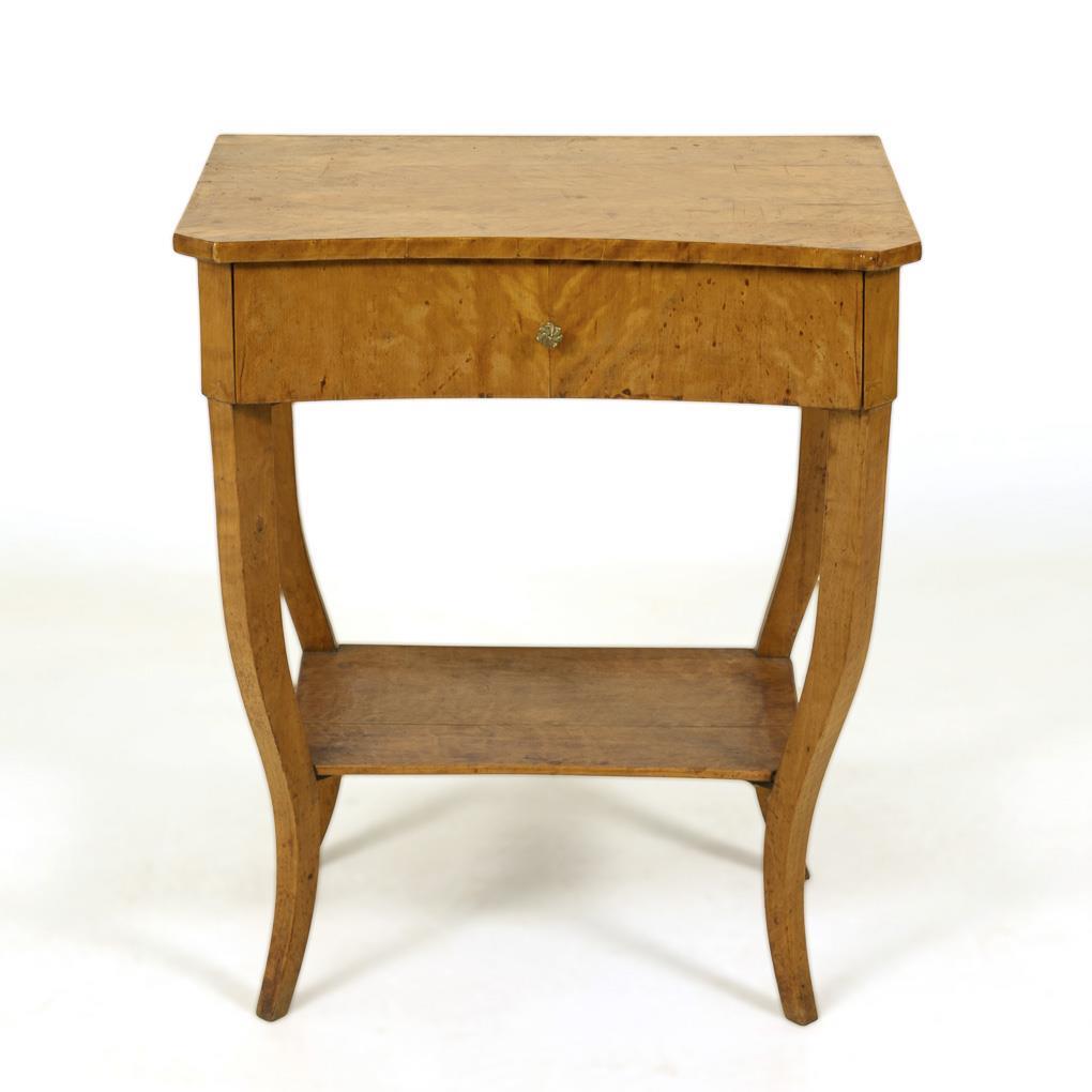 Schlichter Biedermeier-Beistelltisch mit Zargenschub, 4 Säbelbeinen und Tablettstrebe. Alters-/Gebrauchsspuren, restauriert.