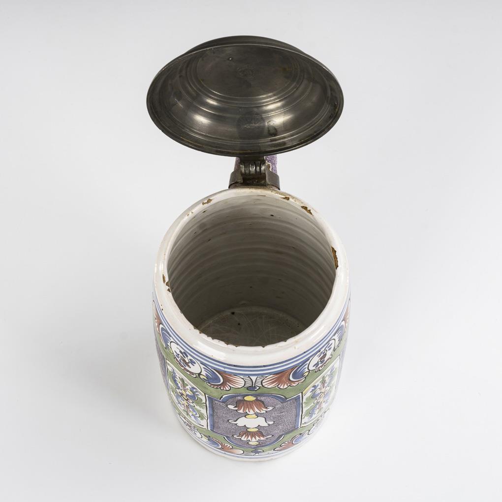 Zylinderform mit Bandhenkel. Manganjaspierte Barockreserven und Blumenmalerei. Profilierter Zinndeckel mit Kugeldrücker und Reliefplakette. Mündungsrand leicht bestoßen, partiell leichte Glasurbereibungen.