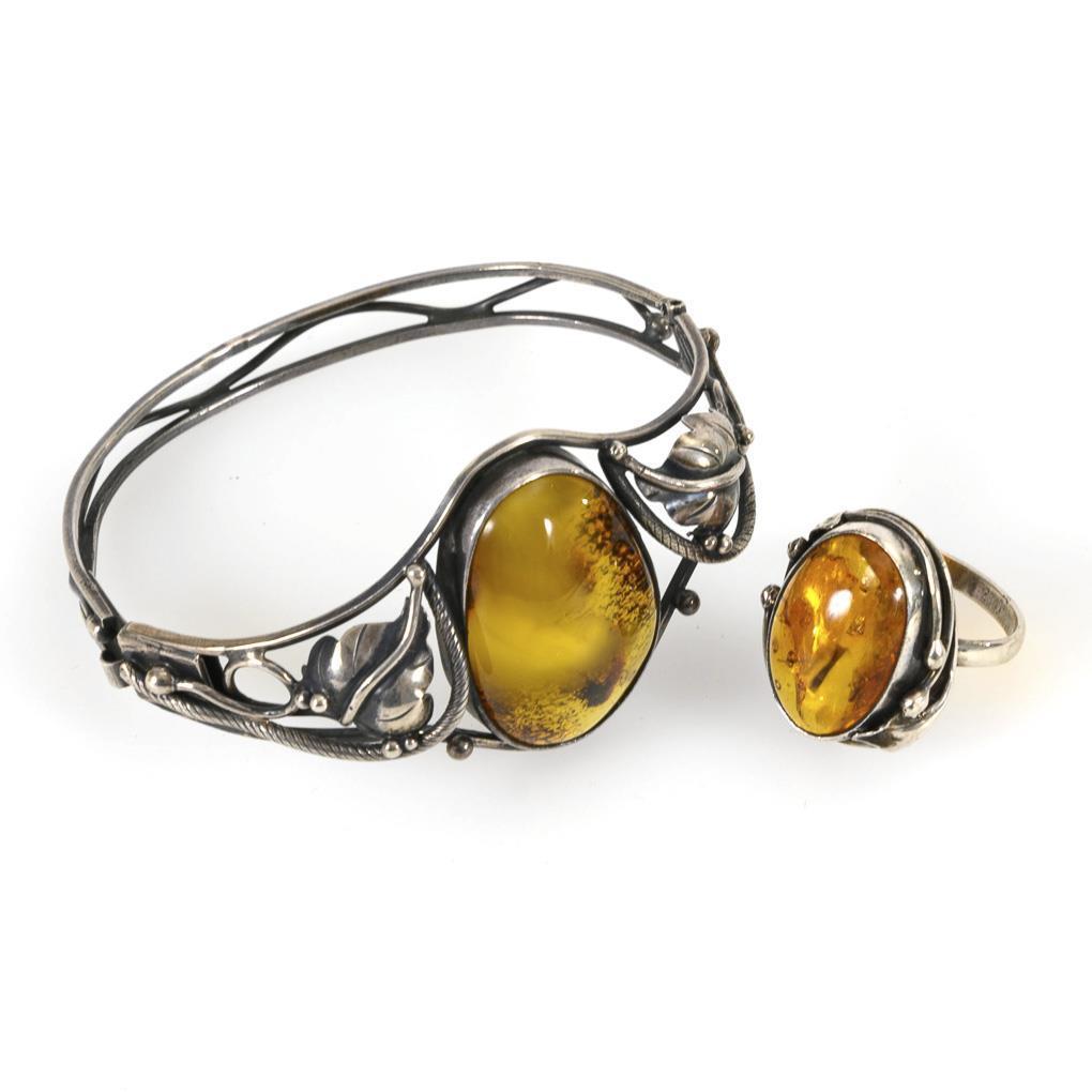Armreif und Ring mit Bernsteinen.