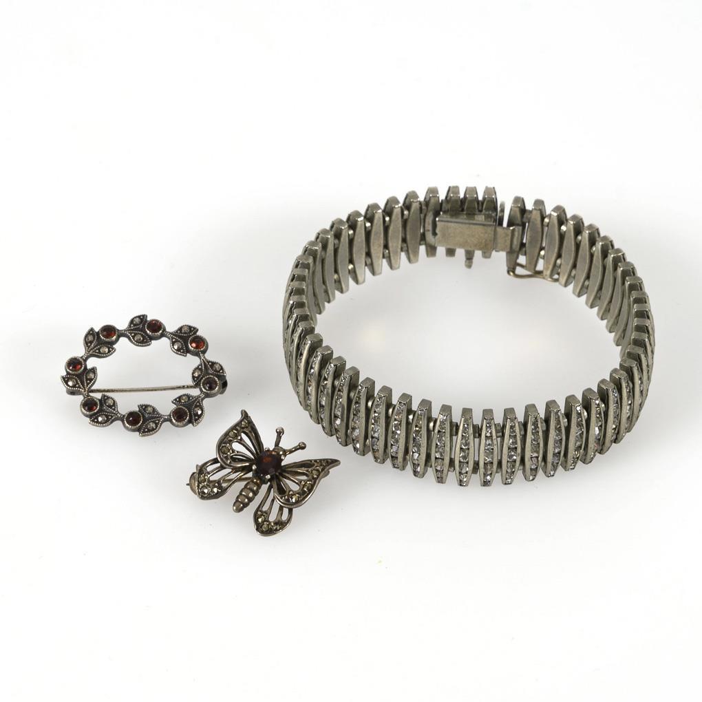 Kranz- und Schmetterlingsbrosche mit Markasiten und Granaten. Kugelhaken. Strassbesetztes Metallband mit Kastenschloss und Achtersicherung.