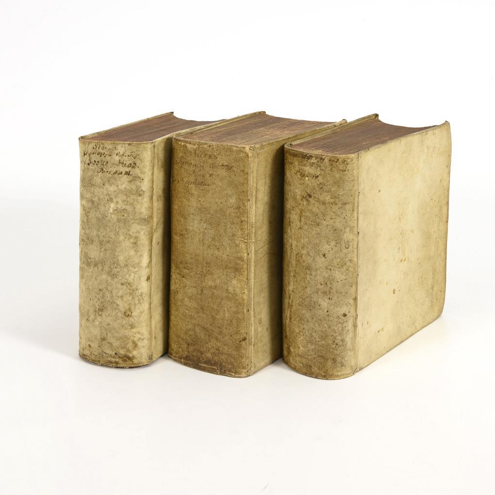 2. bis 5. Teil. (10) Seiten, 1783 Spalten, (12) Seiten, 1279 Spalten / (14) Seiten, 2548 Spalten, (6), 195 Seiten / (18) Seiten), 2678 Spalten, (6) Seiten, 784 Spalten. Alle im Pergamenteinband mit Rotschnitt.
