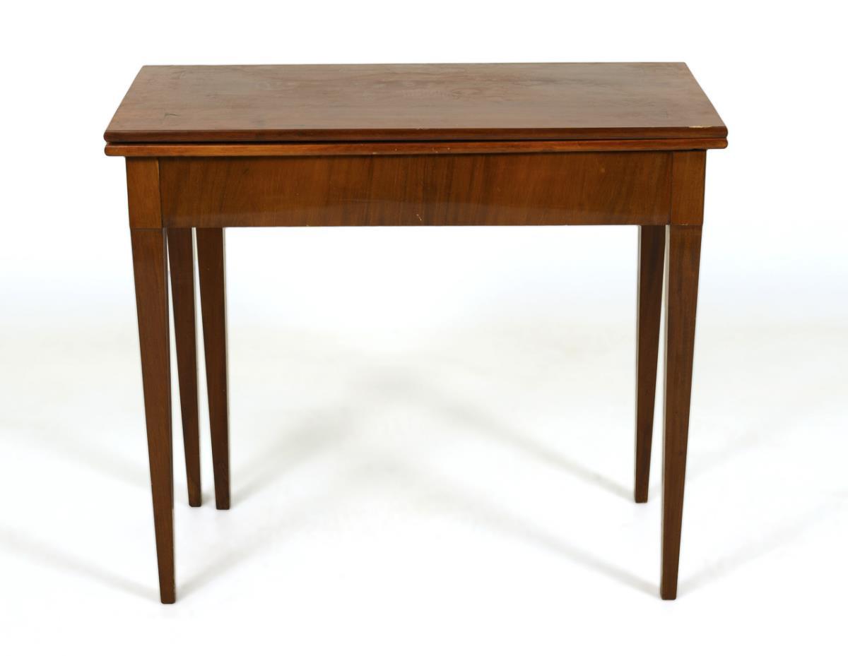 Schlichter rechteckiger Spiel- und Konsoltisch mit abnehmbarer und aufklappbarer Deckplatte auf Zargenkasten, 1 bewegbares Bein mit Stützfunktion; Zargenkasten innen mit Spielbrett für Backgammon ausgekleidet. Als Zubehör 32 Spielsteine. Alters-/Gebrauchsspuren, Furnier teils gelöst.