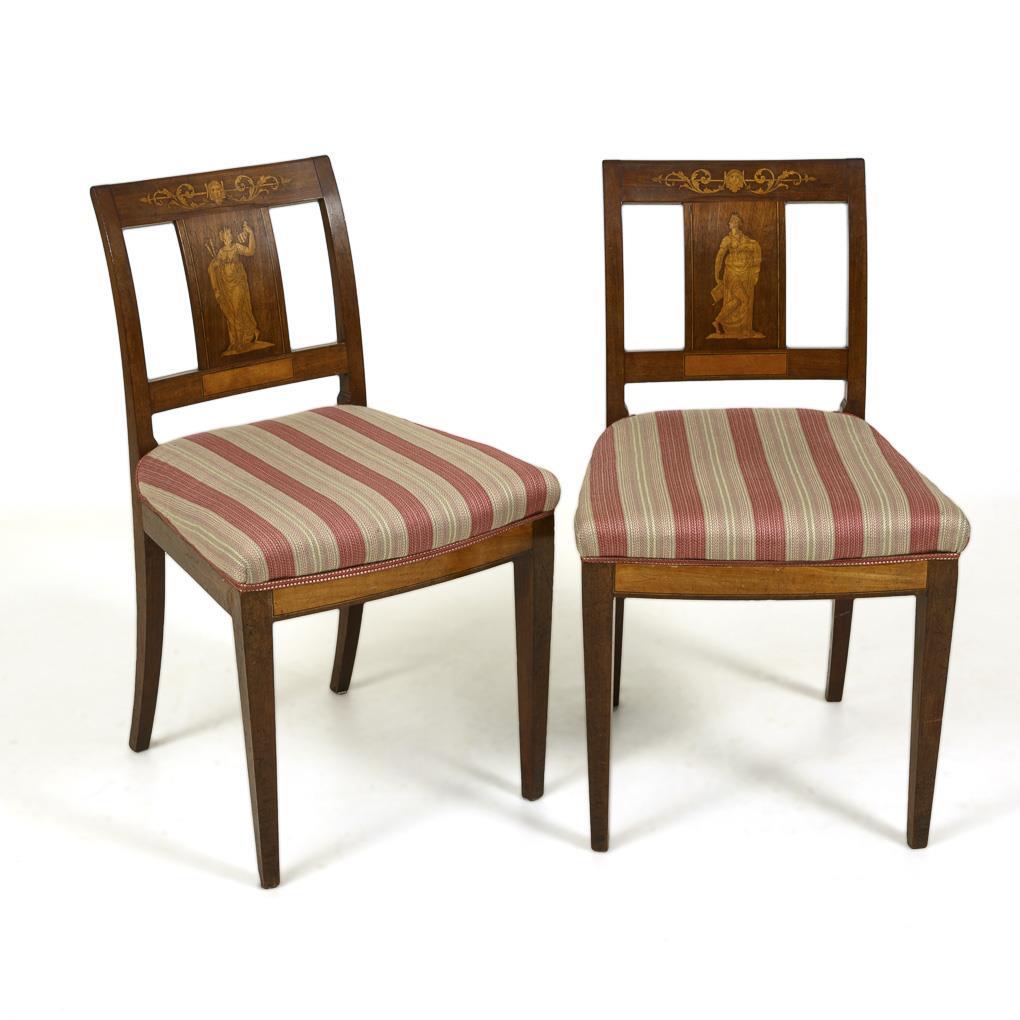 2 gepolsterte Lehnstühle im Biedermeier-Stil, Rückenlehnen fein marketiert mit Musendarstellung und Akanthusblattranke; rot-gestreifter Bezug. Leichte Alters-/Gebrauchsspuren.