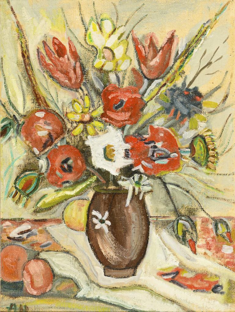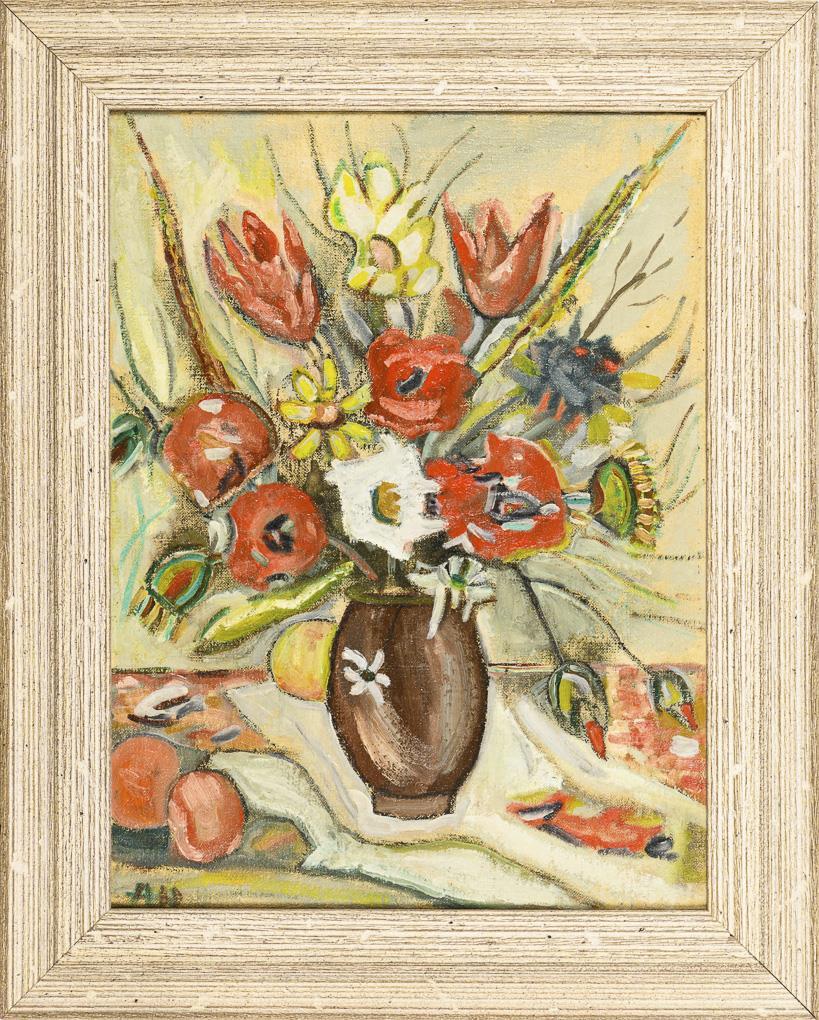 Naiv gemalter Strauß mit verschiedenen Blumen auf einem Tisch neben Früchten.