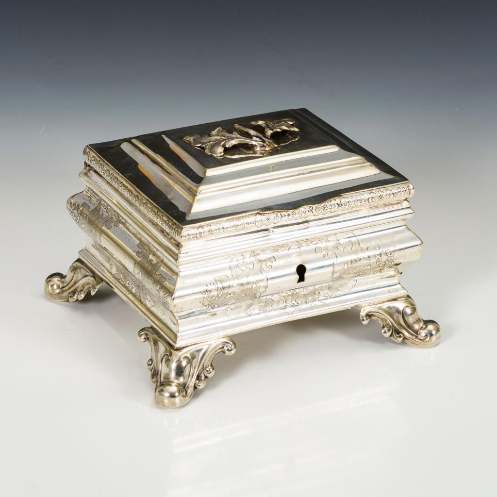 Profilierte Rechteckform mit Rankengravuren und 4 ausgestellten Rocaillenfüßen. Mit Defekten (Schloss fehlt, Deckelknauf defekt, Lötspuren am Scharnier).