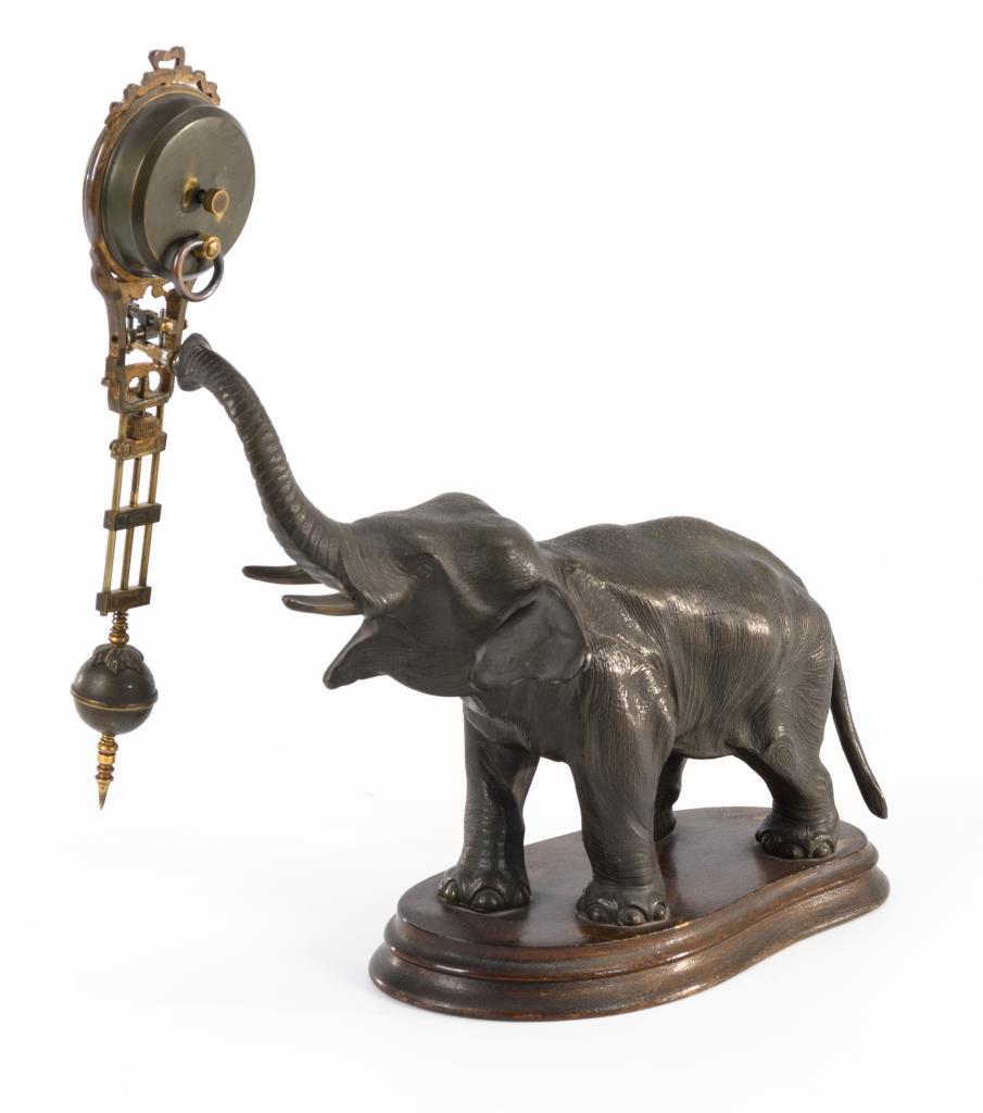 Metall, dunkel bronziert. Elefantenplastik auf ovalem Holzsockel, am Rüssel eine Montur zur Aufhängung der Uhr. Werk läuft.Lötspuren, leichte Gebrauchsspuren.
