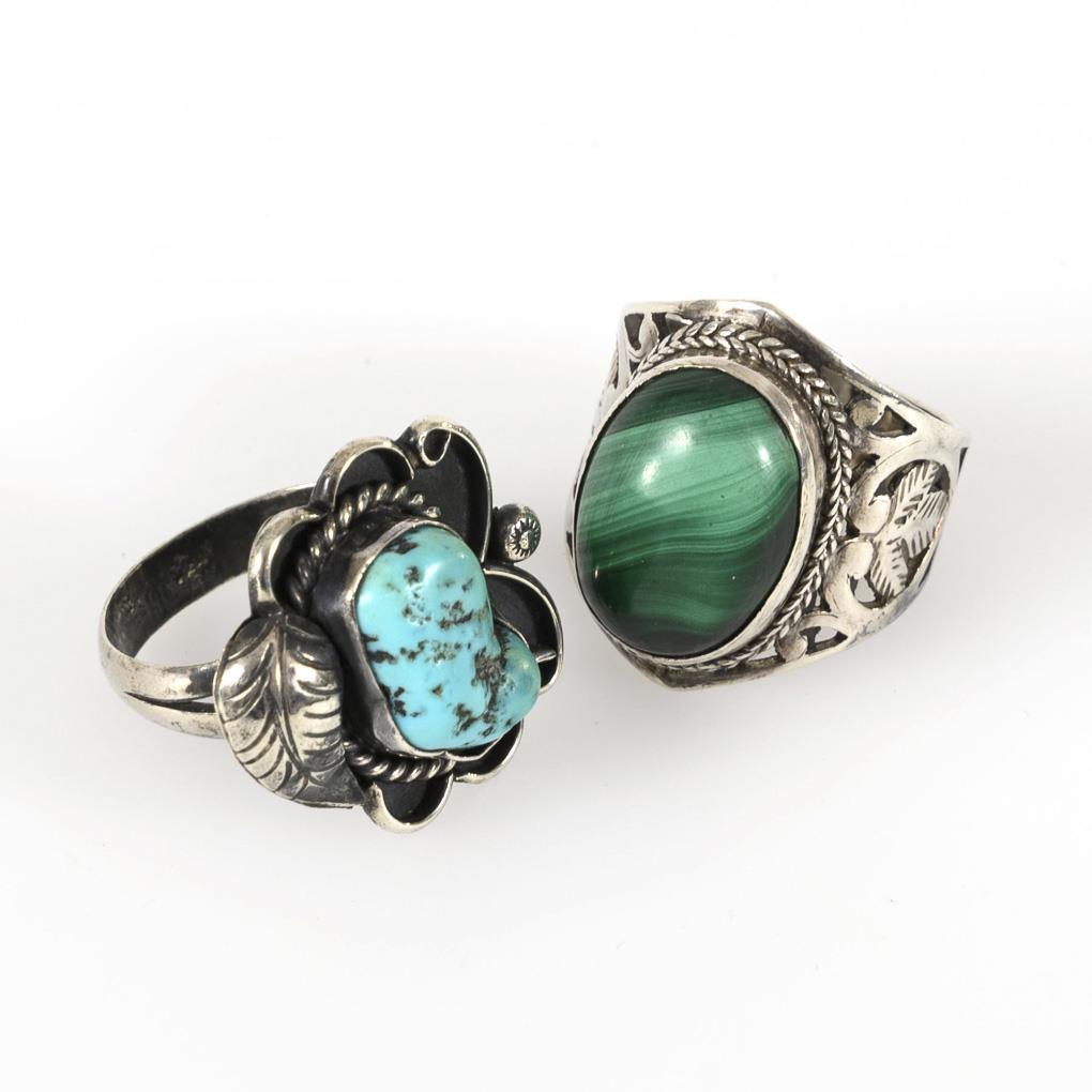 Zargengefasster Malachit- und Matrixtürkiscabochon in verzierter Ringschulter und Rahmen. Breite und mittlere Schiene.