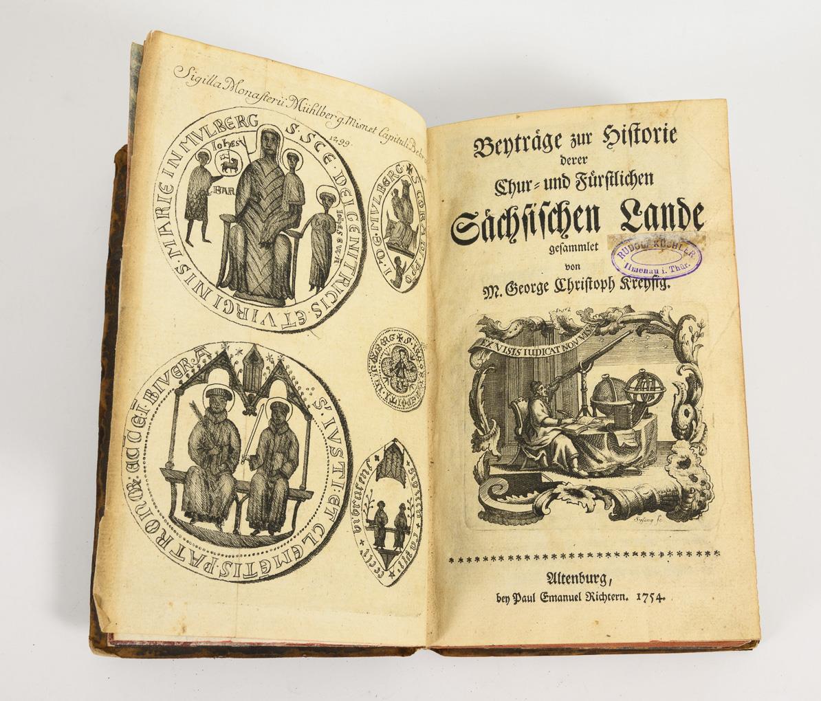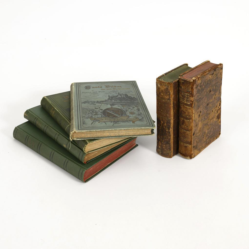 "Bunte Bilder aus dem Sachsenlande", Herausgegeben vom Sächsischen Pestalozzi-Vereine, Leipzig 1892-1909. 4 Bände mit zahlreichen Holzstichen. / Harnisch: "Das preußische Sachsenland", Weißenfels 1827. 18, 158 Seiten und "Lebensbilder aus dem preußischen Sachsenlande, 474 Seiten und 2 Karten. In einem Buch. / Kreysig, Georg Christoph. "Beyträge zur Historie derer Chur- und Fürstlichen Sächsischen Lande", Altenburg bei Paul Emauel Richtern, 1754. Titelkupfer, Titel, (8), 484 Seiten und eine Tafel. Altersgemäße Gebrauchsspuren.