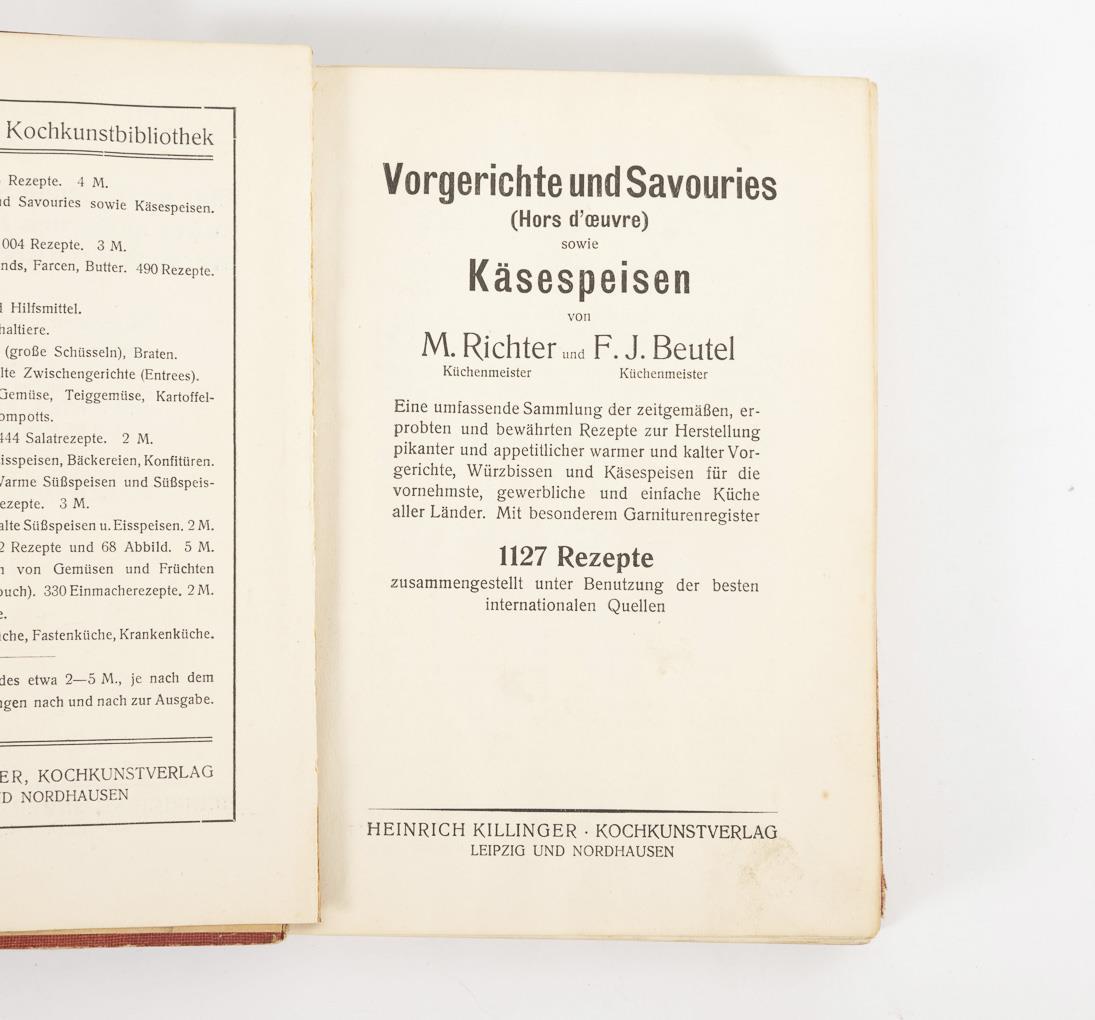 Bd. II, Vorgerichte und Savouries sowie Käsespeisen, 320 Seiten, Rücken geklebt. / Bd. III, Eierspeisen, 276 S. / Bd. IV, Saucen und Fonds, Butter, Farcen, 140 S. / Bd. V., Garnituren, Hilfsmittel, Fachausdrücke und Fremdwörter, 212 S. / Bd. VII., Warme Fleischspeisen, 759 S. / Bd. IX, 476 Salatrezepte der modernen feinen und bürgerlichen Küche, 141 S. / Bde. X 1 und 2, Kalte Süss-Speisen, Gefrorenes und Eis-Speisen, 269 und 298 S. / Bd. XII, Preis-Einmachbuch, 193 S. / Bd. XIII, Fleischlose Küche, 160 S. / Bd. XVI, Gänseleberpasteten und andere Gänselebergerichte, 61 S. / Resterküche, 162 S. Alle in rotem Einband. Guter Allgemeinzustand.