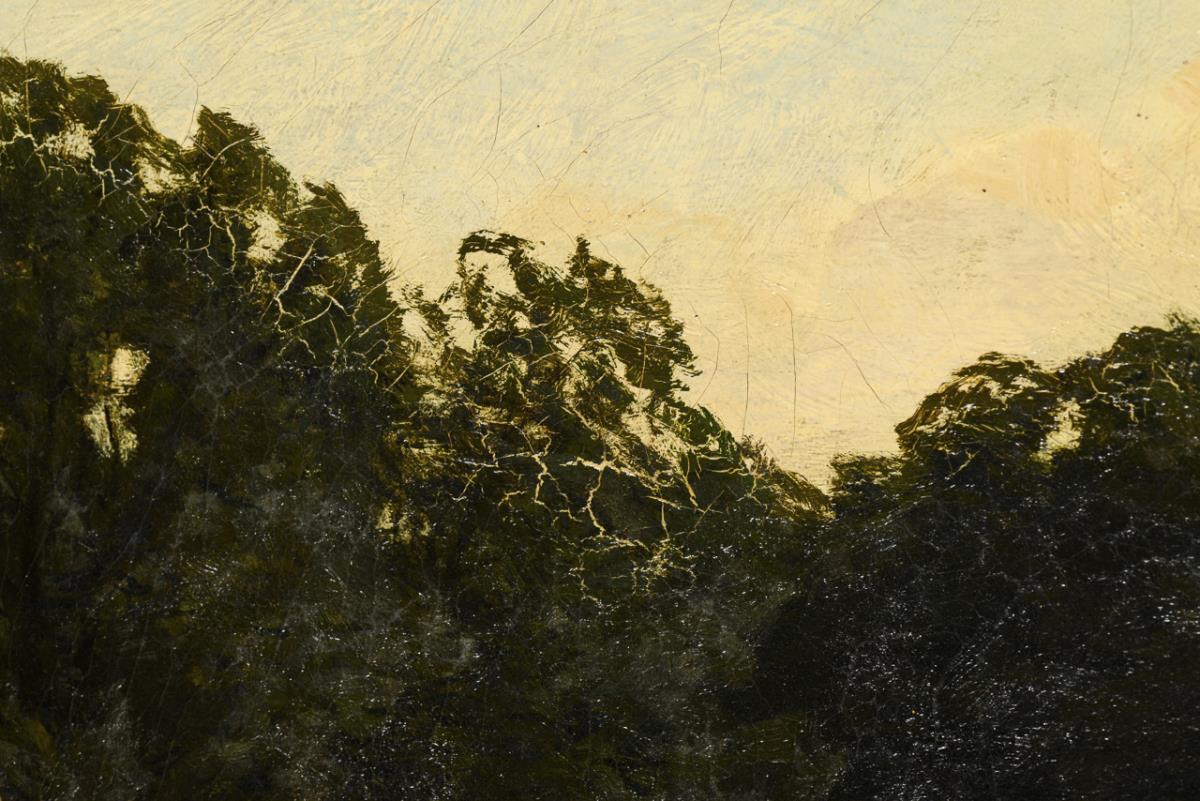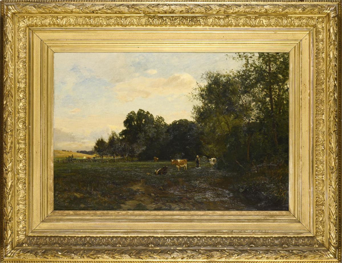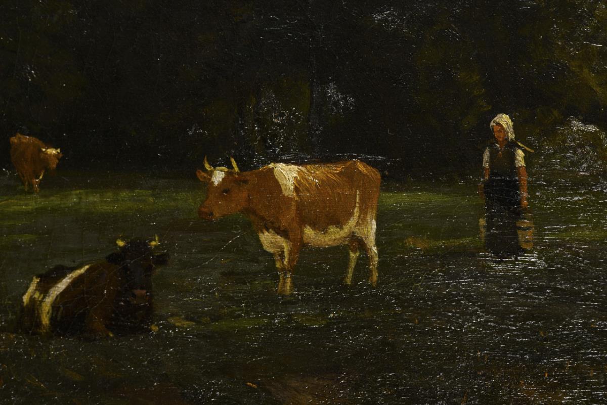 Junge Frau mit Milchkannen bei den Kühen auf der Weide nahe einem Bach am Waldrand. Leinwand doubliert.