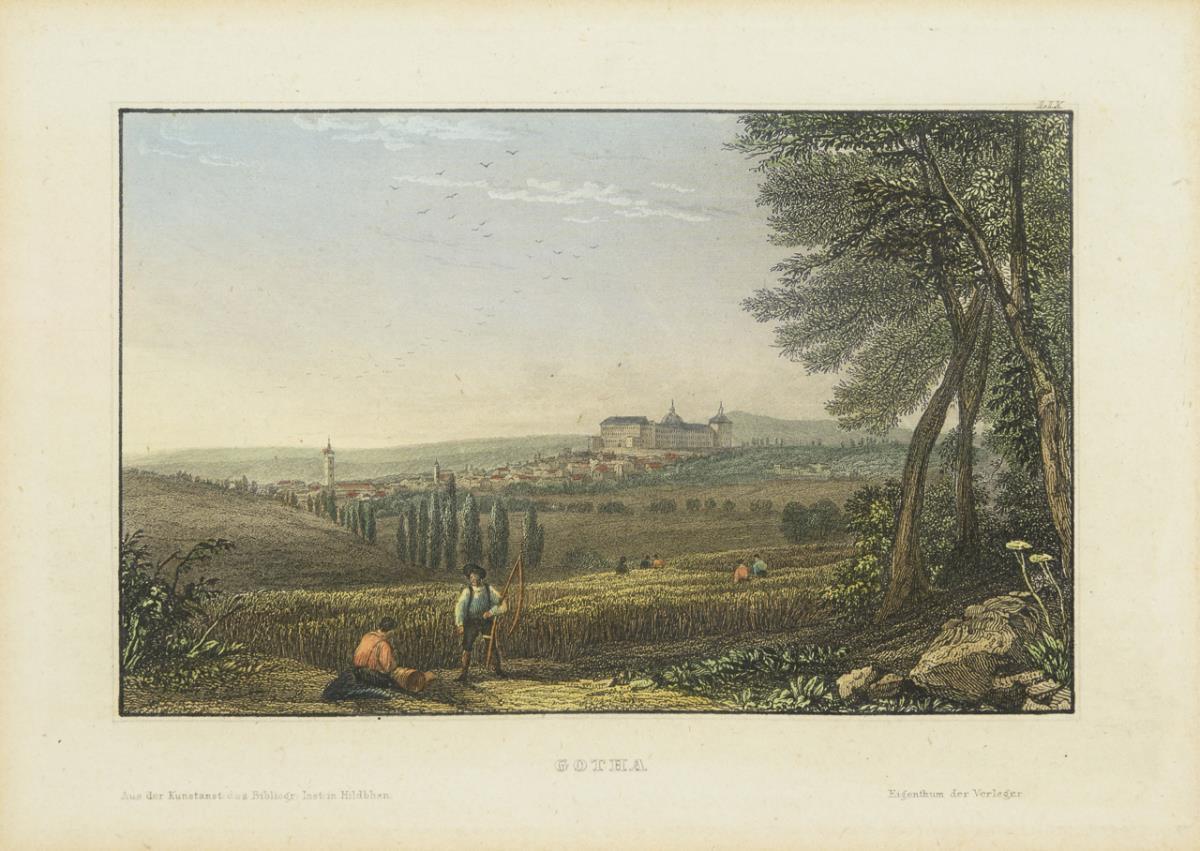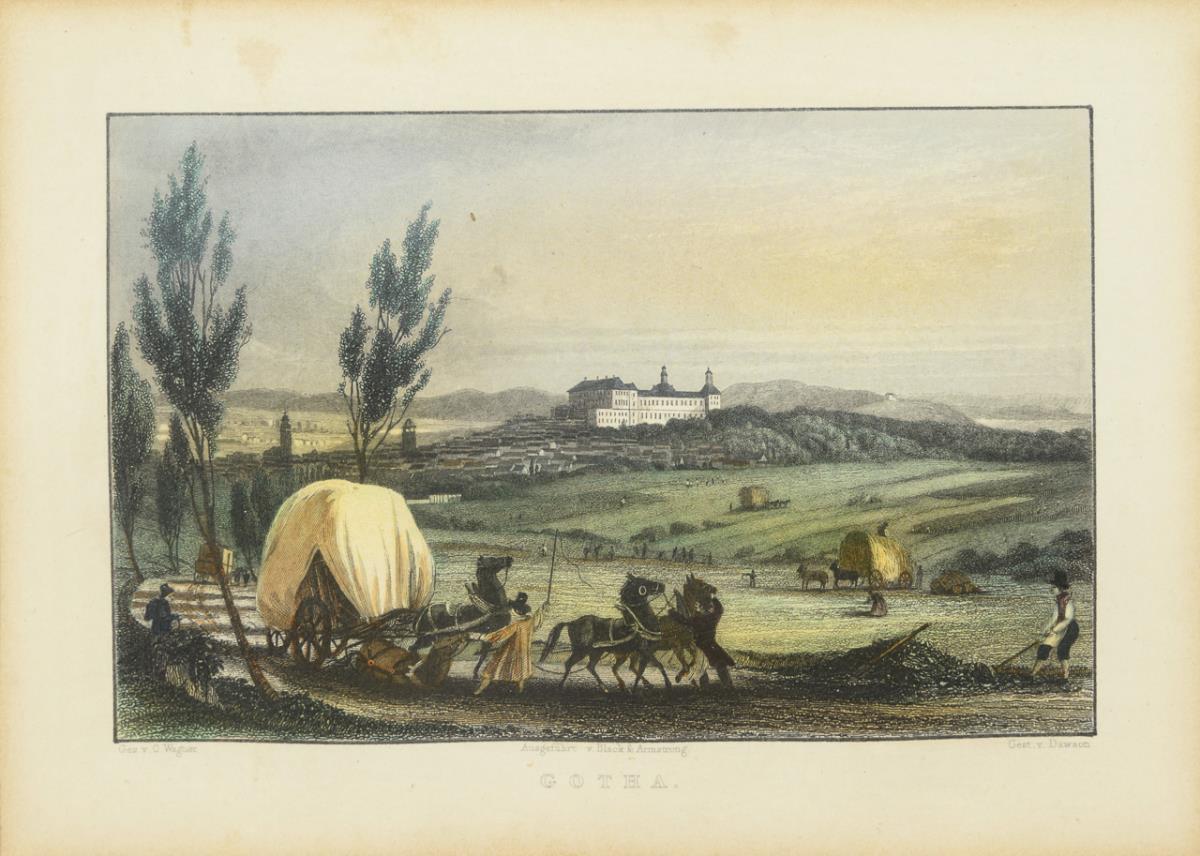 3 fein kolorierte Ansichten mit Blick auf die thüringische Stadt Gotha in 1 Rahmen, nach Gemälden von Otto Wagner (1803- 1861) und Ludwig Rohbock (1824 - 1893). Randbereiche je lichtgebräunt.