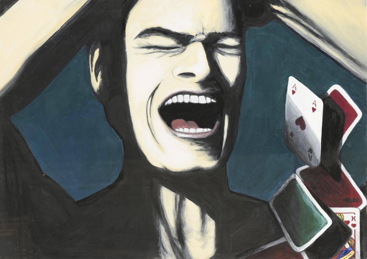Schreiender Mann in grellem Licht neben einstürzendem Kartenhaus.