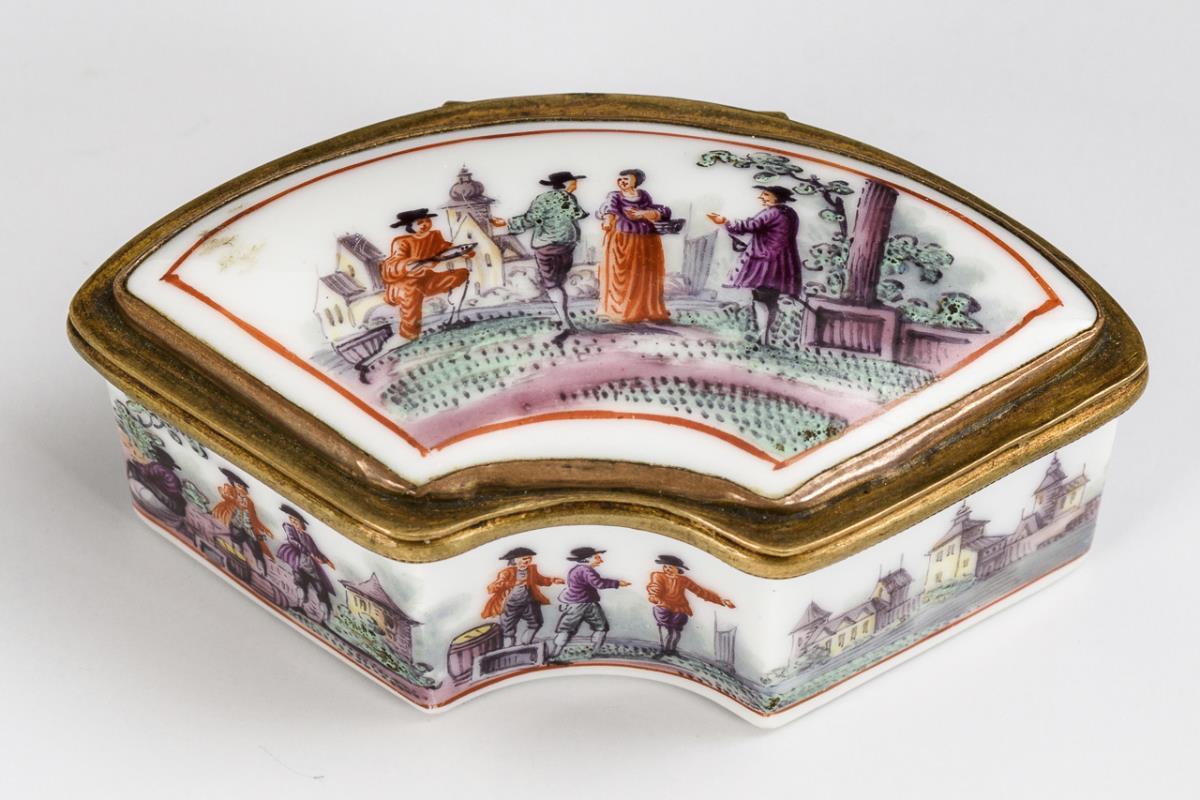 Fächerförmige, kleine Tabatiere mit messingmontiertem Scharnierdeckel. Allseitig und im Deckel fein gemalte Hafenszenen mit Kaufleuten, Fischern und Warenladungen, innen vergoldet.