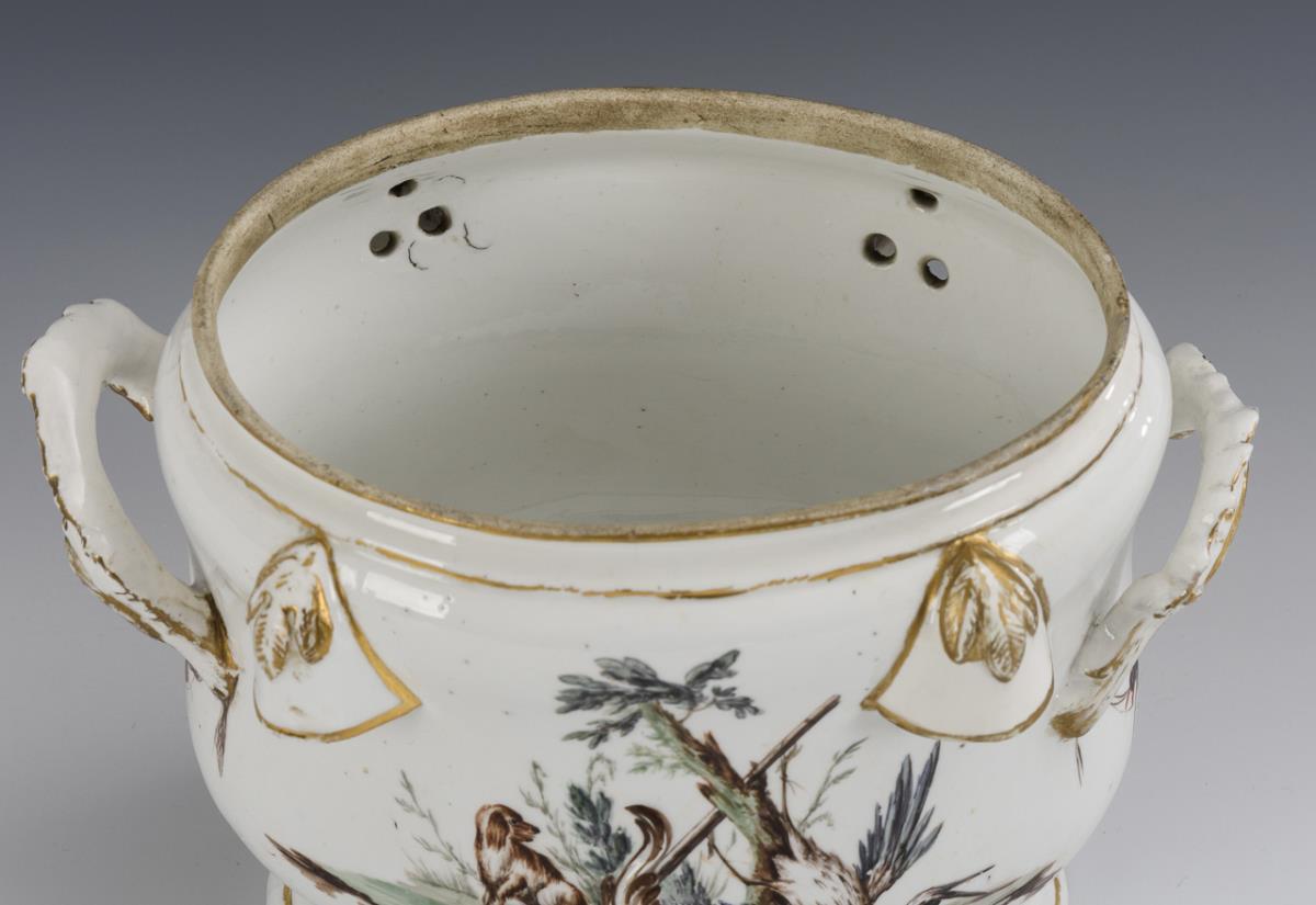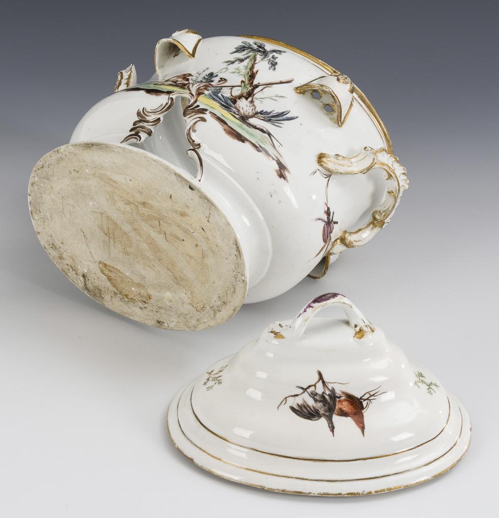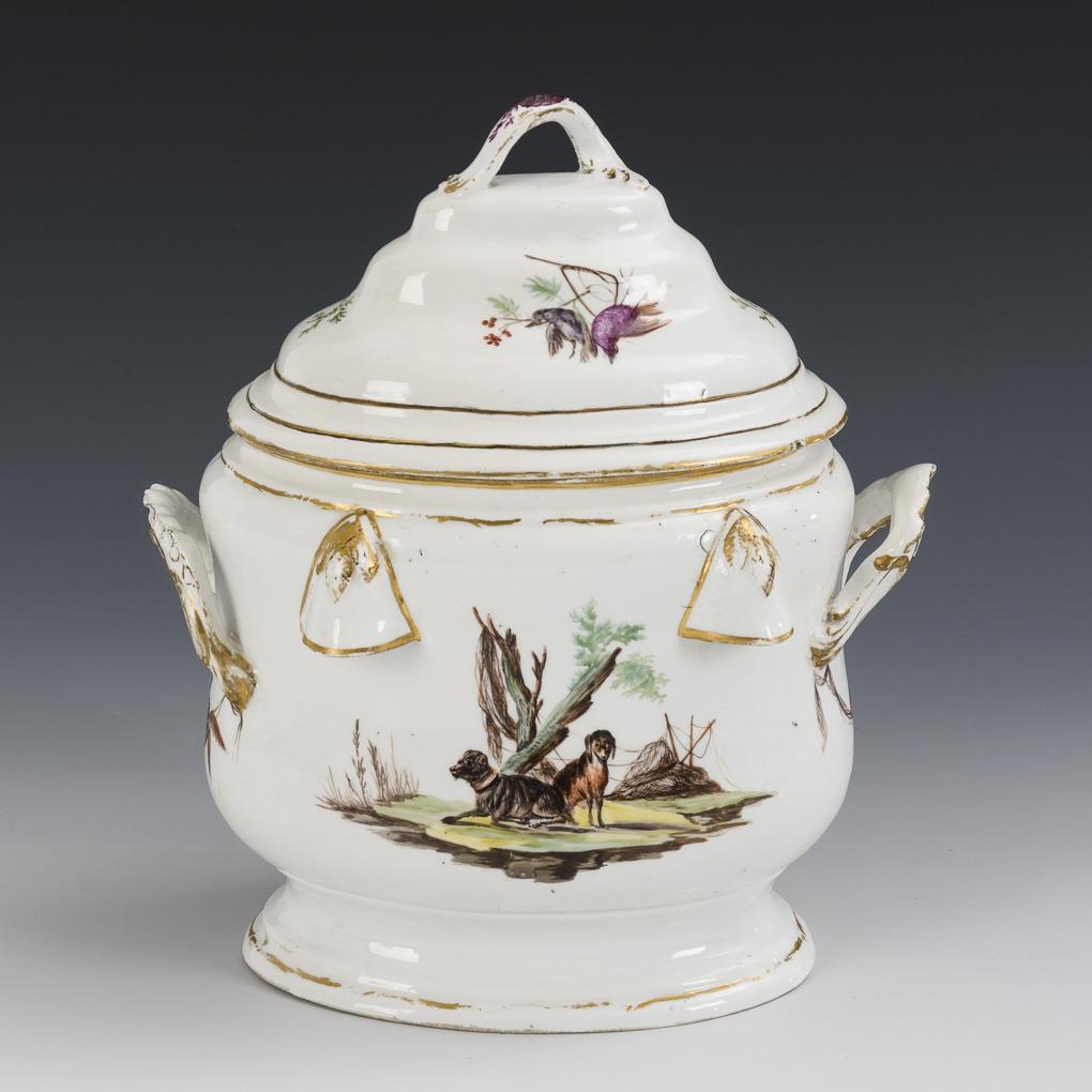 In Form einer Terrine gestaltetes Stövchen/Rechaud mit zwei Rocaillehenkeln, vier verdeckten Luftnasen und Deckel. Beidseitig die Darstellung von Jagdhunden bei der Vogeljagd. Ohne Einsatzschale. Deckel restauriert und mit Randbestoßungen, beide Henkel und 1 Luftnase restauriert.