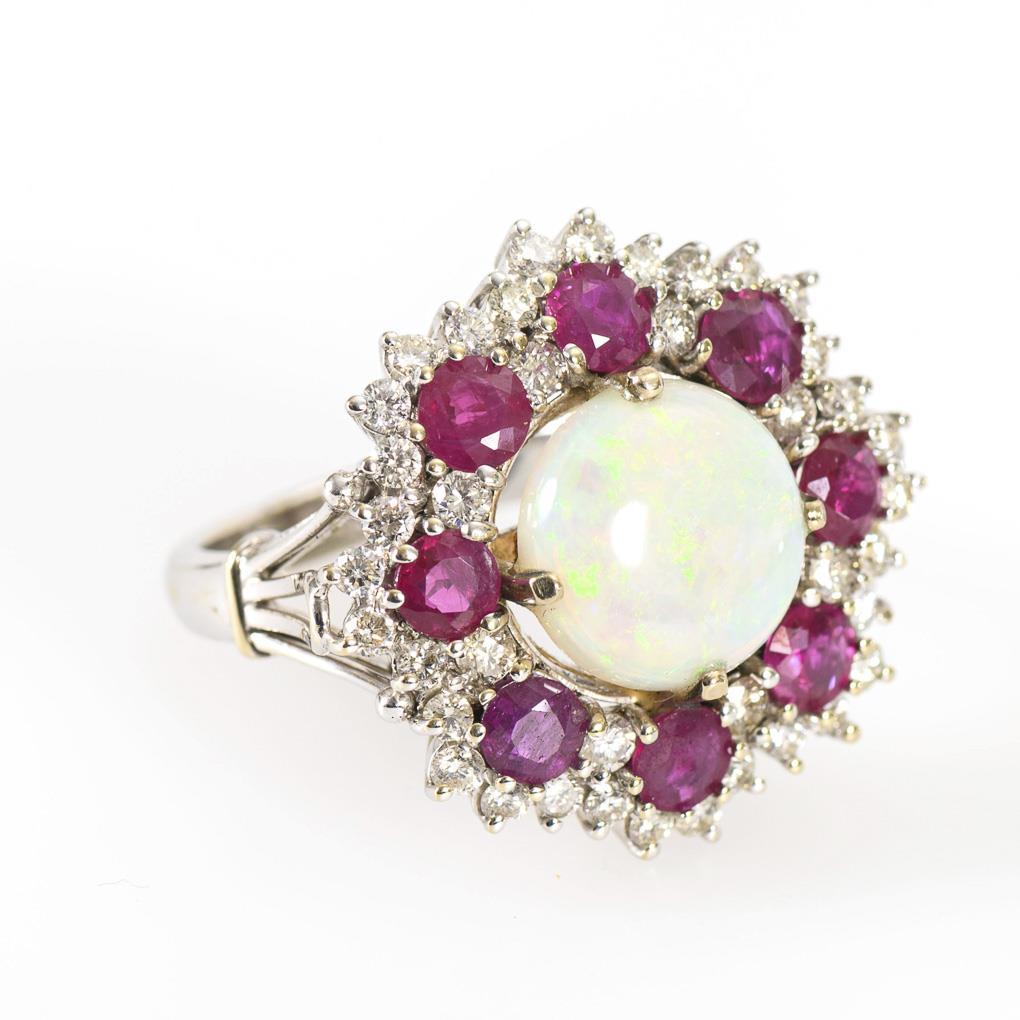 Weißgold 750 geprüft. Ringgröße 62. Opal ca. 4,50 ct/Rubine zus. ca. 3,60 ct/Brillanten zus. ca. 1,44 ct/Weiß/vs-si. 13,6 g.