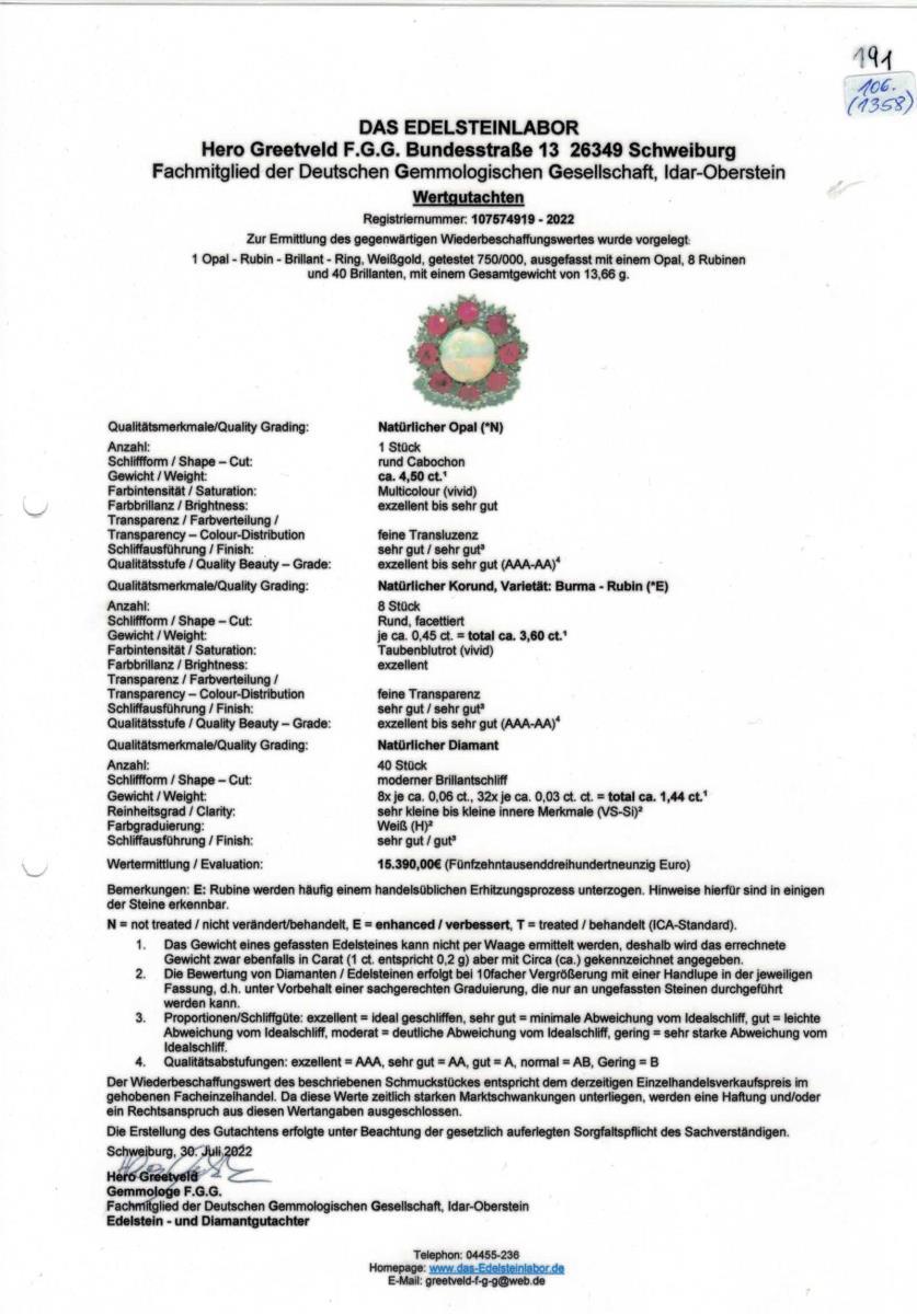 Wertermittlung laut vorliegendem Gutachten von Hero Greetveld in Schweiburg, Fachmitglied der Deutschen Gemmologischen Gesellschaft, Idar-Oberstein von 2022: 15.390,00 Euro.