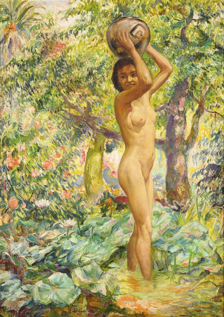 Nackte junge Frau im seichten Wasser zwischen tropischen Pflanzen.