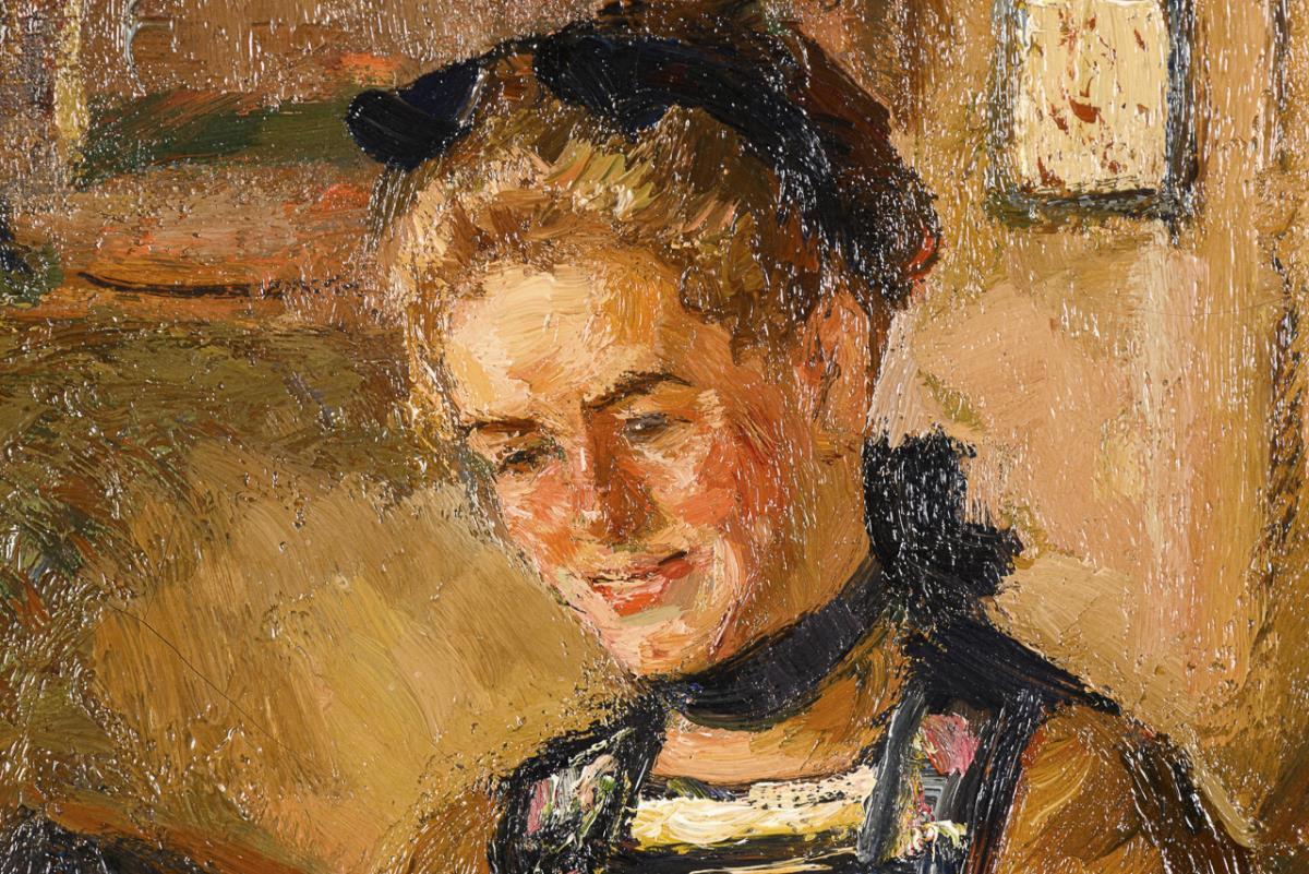Eine junge Frau in freudigem Gespräch mit einem Mädchen am Fenster. Eine sehr kleine restaurierte Stelle.