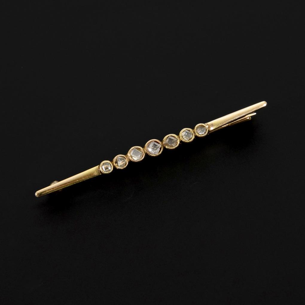 7 kleine, zargengefasste Diamanten zwischen schmalem Steg. Einfacher Haken. 1 kleiner Diamant mit Ausbruch.