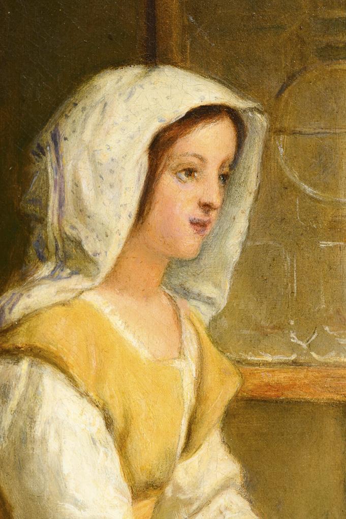 Junge Frau am offenen Fenster beim Spinnen des Garns im Sonnenschein. Eine kleine restaurierte Stelle rechts oben.