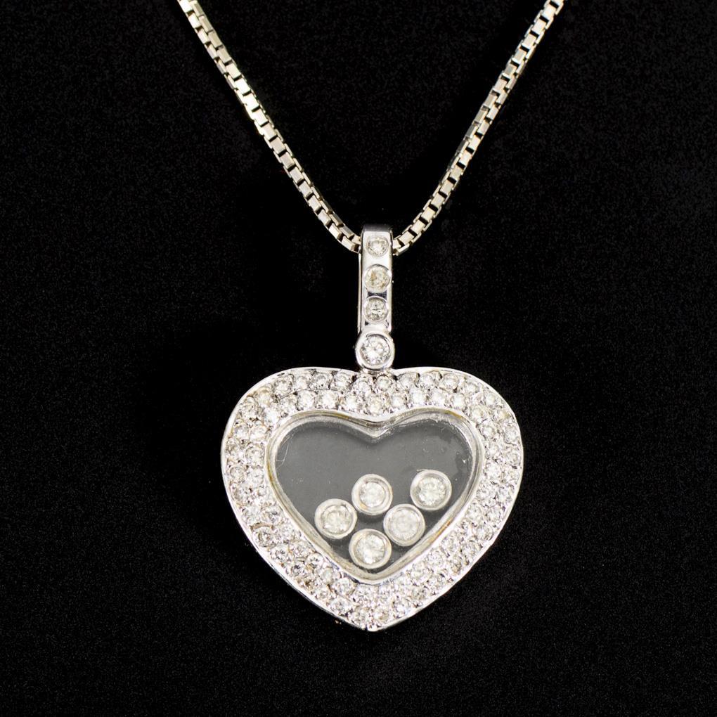 Anhänger mit 79 eingelassenen Brillanten, davon 5 zargengefasste Brillanten beweglich unter Glaseinlagen. Venezianerkette mit Ringfederschließe.
