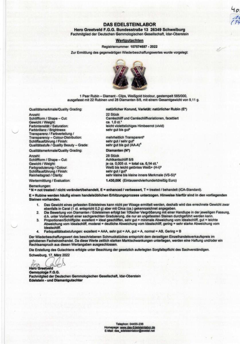 Wertermittlung laut vorliegendem Gutachten von Hero Greetveld F.G.G. in Schweiburg. Fachmitglied der Deutschen Gemmologischen Gesellschaft, Idar-Oberstein von 2022: 1.430,00 Euro.