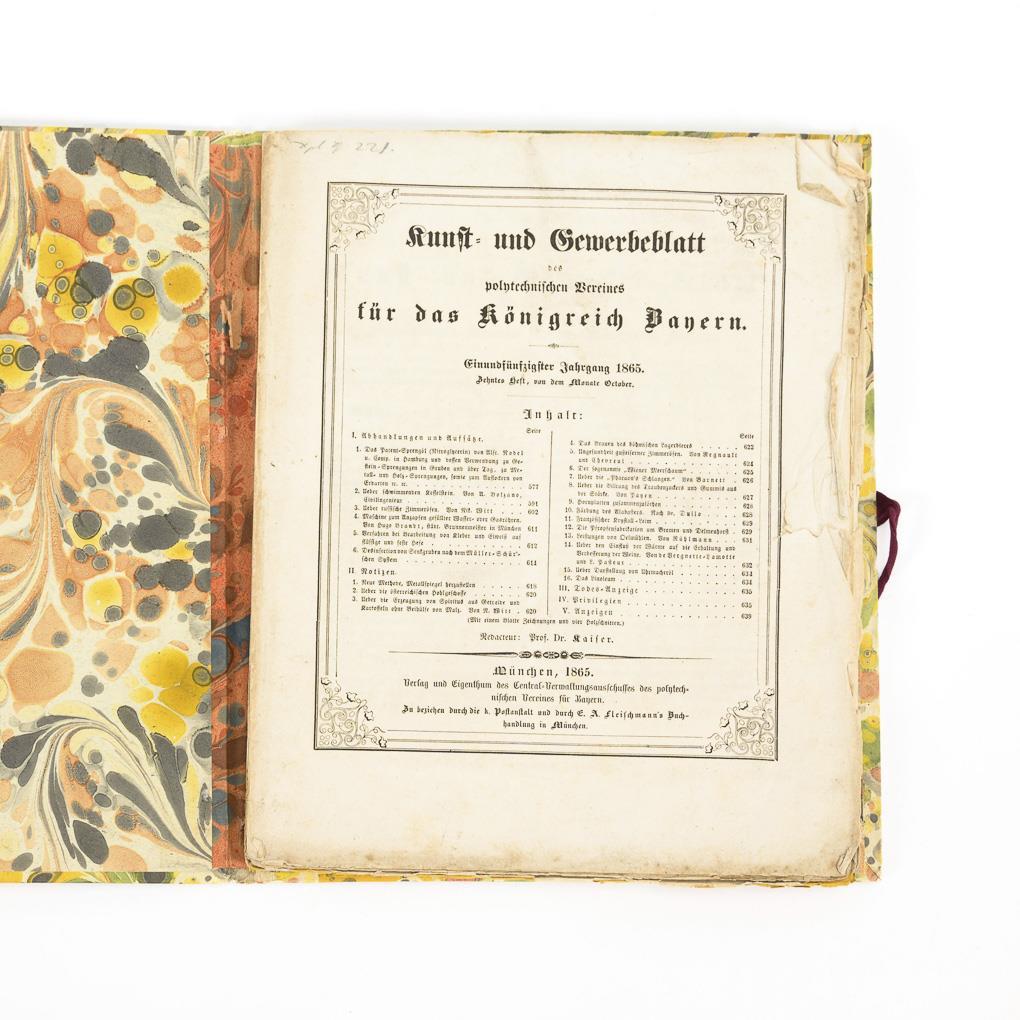 51. Jahrgang 1865, zehntes Heft von dem Monat October und 52. Jahrgang 1866, 2. Heft vom Monate Februar. Aus dem Inhalt: "Das brauen des böhmischen Lagerbieres", "Hornplatten zusammenzulöten", "Über Darstellung von Uhrmacheröl", "Das Linoleum" und vieles andere mehr. Mit zwei Tafel. In jüngerer Mappe mit Marmorpapier. Seitenränder bestoßen.
