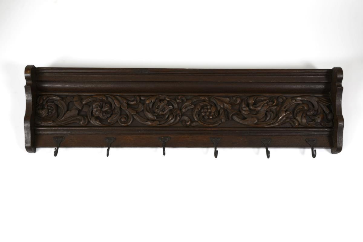 Schwere Wandgarderobe mit 6 handgeschmiedeten Haken, üppig verziert mit Akanthusblattschnitzerei. Leichte Alters-/Gebrauchsspuren.