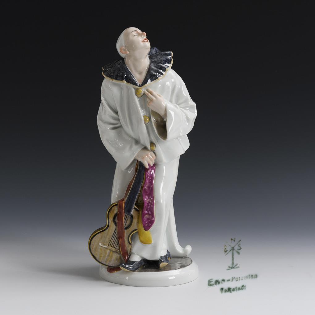 An einem Säulenstumpf lehnender, sehnsüchtig zum Himmel emporblickender Pierrot mit Gitarre.