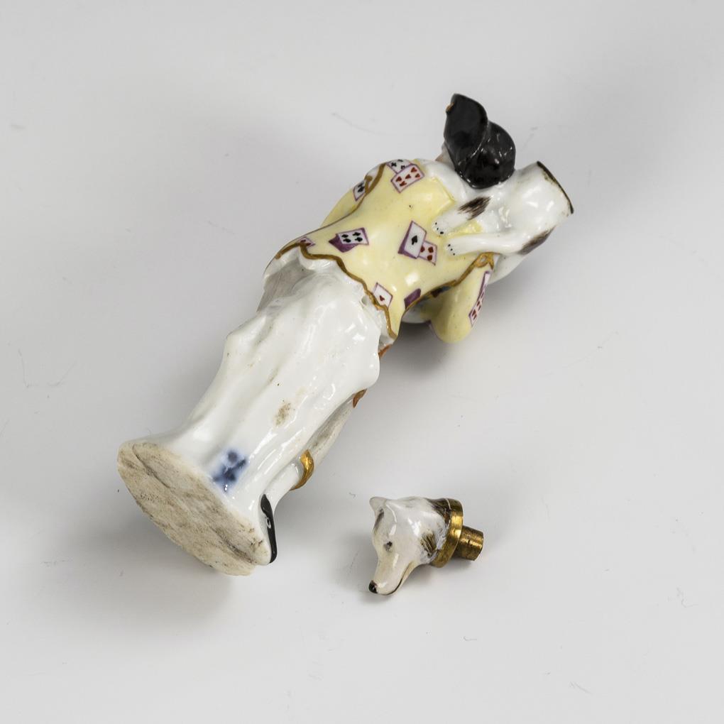 Stehender, einen Hund auf den Armen tragender Harlekin, der Kopf des Hundes als Flakonstopfen. Hundekopf restauriert.
