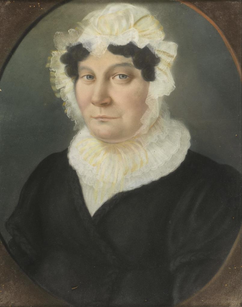 Bildnis eines Mannes im dunklen Gehrock sowie einer Frau im dunklen Kleid mit weißer Rüschenhaube. Einmal kleine Löcher an den Bildrändern.
