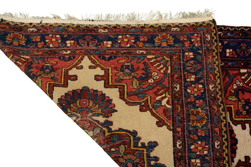 Kleiner Teppich mit dominierendem Blütenmedaillon und korrespondierenden Ecken auf offenem elfenbeinfarbenen Spiegel, mehrreihige Blumenbordüre mit Boteh-Reihen. Leichte Alters- und Gebrauchsspuren, mittig restauriert.