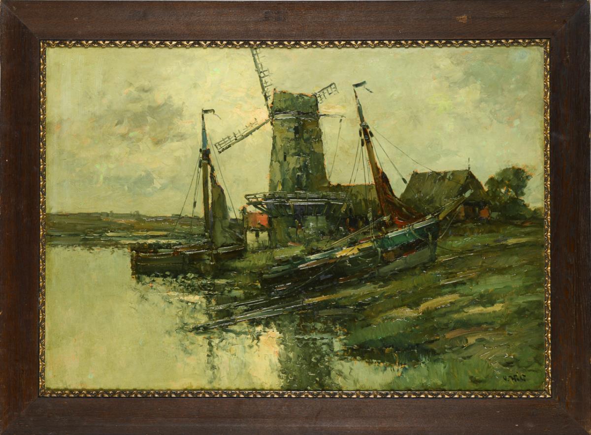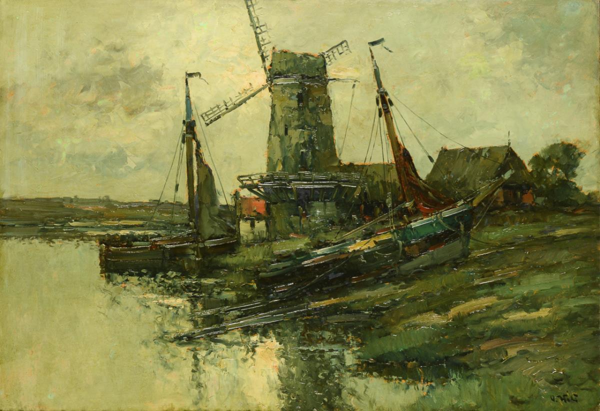 Fischerboote am Ufer nahe der Mühle unter wolkigem Himmel. Im Himmel wenig retuschiert.