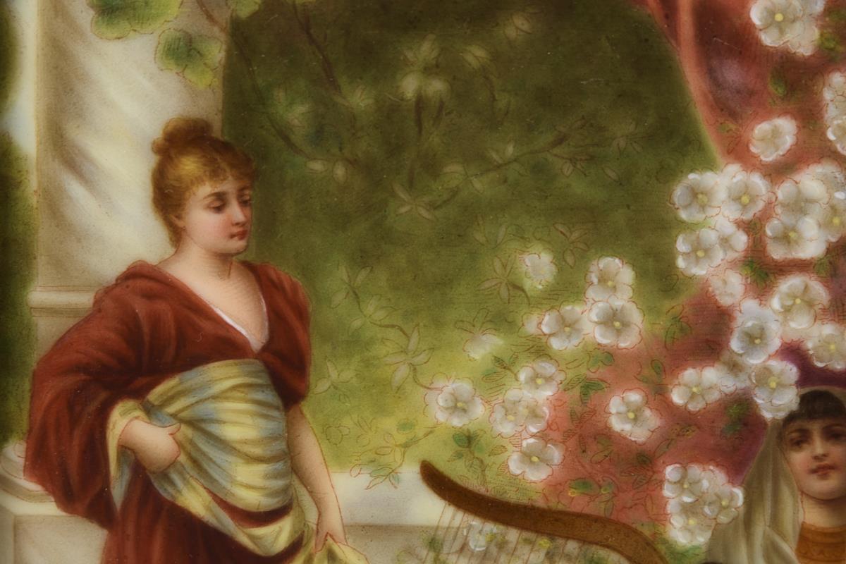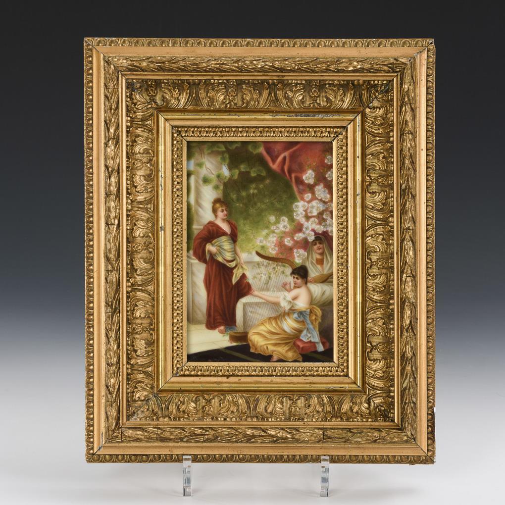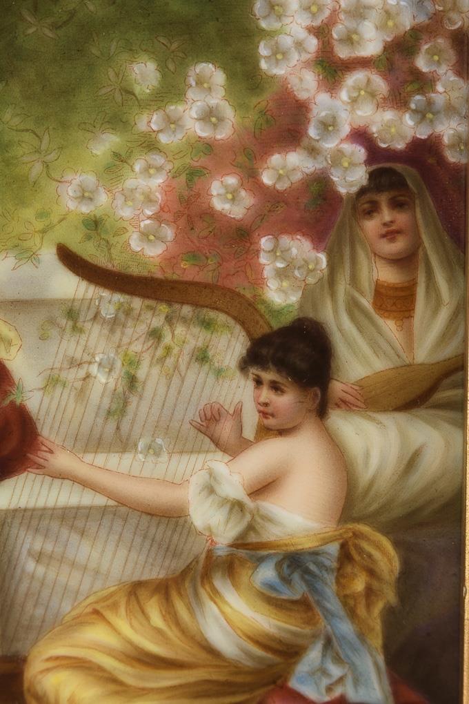 Rechteckige Platte mit der orientalistischen Darstellung dreier musizierender Frauen. Rahmen an den Ecken etwas bestoßen.