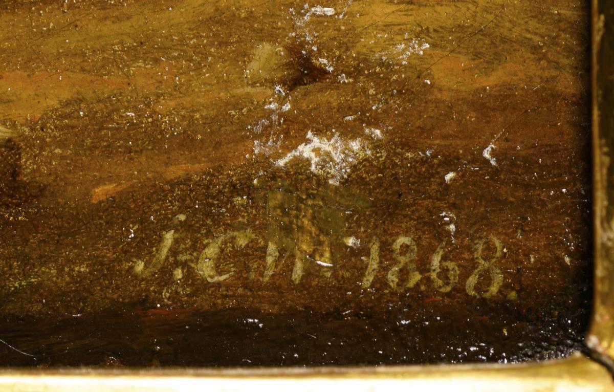 Öl/Malkarton. Rechts unten monogrammiert. 1868.