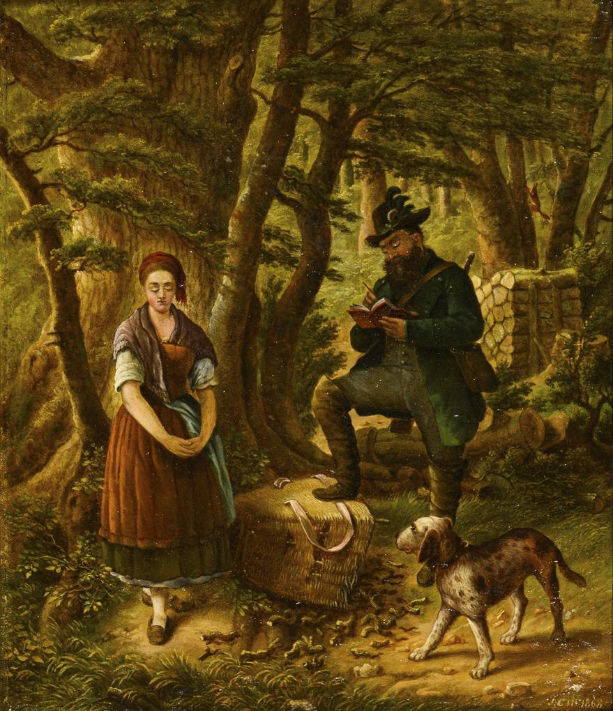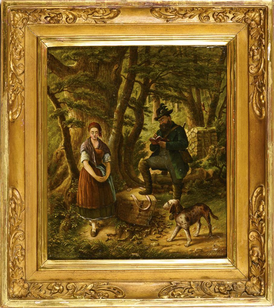 Jäger mit junger Magd und einem Weidenkorb voller Kleinholz im Wald. Leichte Altersspuren.