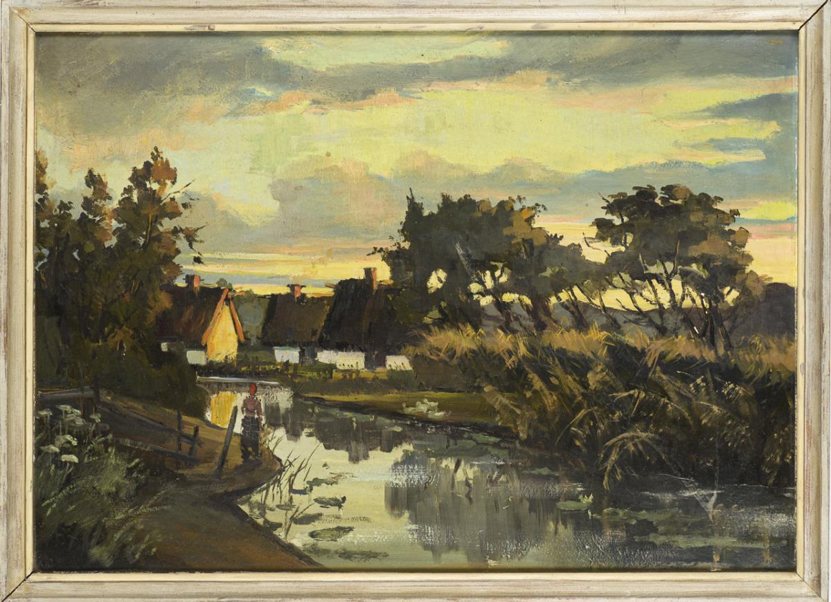 Staffagefigur am Kanal nahe den reetgedeckten Häusern am Abend. Altersspuren.